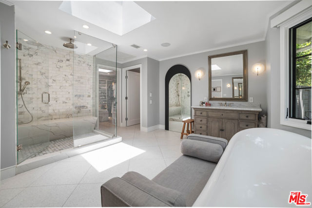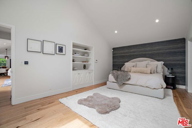 Sun-drenched elegance meets modern luxury in this impeccably renovated single-story retreat. The expansive open floor plan boasts soaring ceilings and walls of glass, seamlessly connecting formal living and dining areas to a resort-style backyard oasis complete with a lush lawn, sparkling pool, and a built-in BBQ ideal for entertaining. The oversized chef's kitchen is outfitted with premium appliances and abundant counter space, making it both functional and impressive. The primary suite is a serene haven with pitched ceilings, dual custom closets, and a spa-like bath featuring upscale finishes, separate shower and soaking tub, dual vanities, and two water closets. Three additional spacious bedrooms offer flexibility for family or guests. The finished garage is climate-controlled and perfect as a gym, playroom, or creative studio, with generous built-in storage. Recent upgrades include a 120 sq ft laundry room with sink and cabinetry, Tesla charger, rich hardwood floors, designer lighting, bespoke tilework, and charming crystal hardware throughout. Fully walled and hedged for ultimate privacy, this turnkey property is a true sanctuary located near the prestigious Roscomare Road Elementary School. Available now-