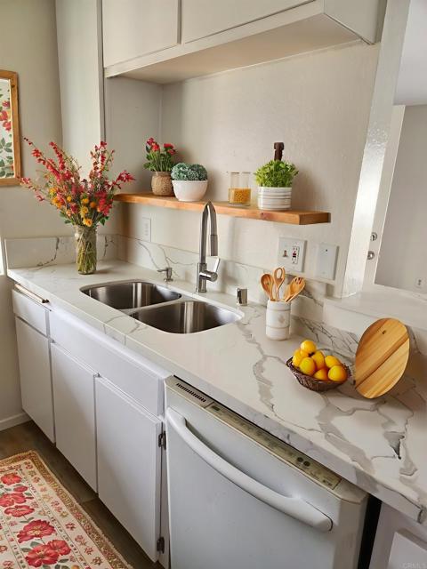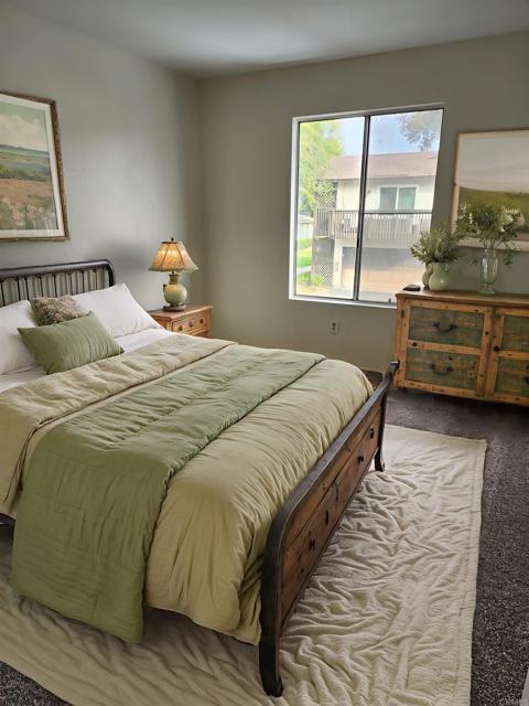 Welcome to Carefree East HOA close to Santana High School and Hill Creek School. Lovely Upstairs unit located over the garages with generous outside balcony. Spacious and open concept living room, dining room and kitchen with natural lighting. The 2 bedroom, 1 bath boasts new flooring, quartz countertops in kitchen and bath, new kitchen sink, faucet, disposal, range and bathroom upgrades. Shared garage with another unit and separate walk-in closet storage. Community coin-op laundry facilities throughout the Carefree complex. Close to pool and open greenbelt.
