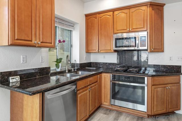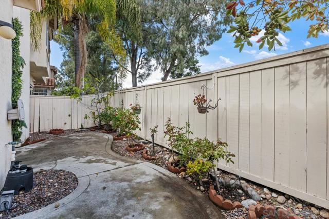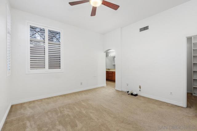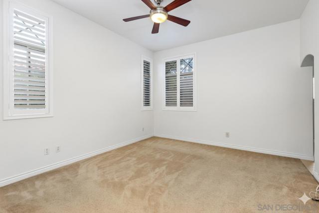 Discover a beautifully upgraded townhome in the prestigious Scripps Legacy Campton community. Located in a tranquil private cul-de-sac, this home offers exceptional privacy and lovely peak mountain views. The inviting main level features soaring vaulted ceilings and an elegant living room with a cozy fireplace highlighted by a granite surround and custom wood mantle. The kitchen is fully equipped with granite countertops and sleek stainless steel appliances. For added convenience, a newer washer and dryer are included, and the home boasts stylish Plantation Shutters throughout. A highly desirable feature is the downstairs bedroom with a full bathroom, perfect for guests or a home office. Upstairs, the spacious primary suite includes a luxurious ensuite bath with a separate tub and shower, dual sinks, and a walk-in closet fitted with a customized closet system. All bathrooms are finished with Corian countertops. The property also includes an attached 2-car garage with custom built-in cabinets for ample storage. Enjoy entertaining or simply relaxing in the private, quiet backyard. Community amenities include a resort-style swimming pool and jacuzzi, and the home is within walking distance of a local park. Residents also benefit from quick access to local trails and award-winning schools.