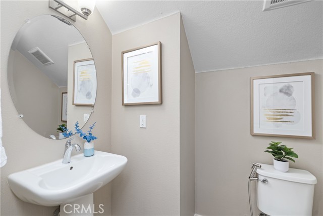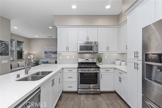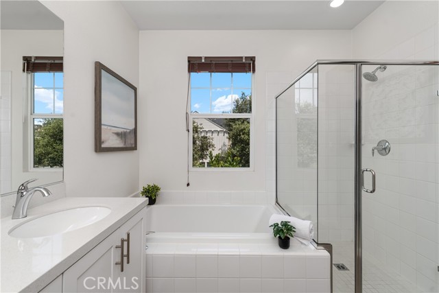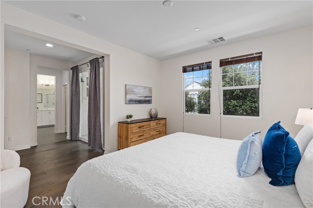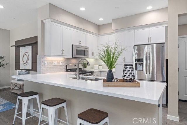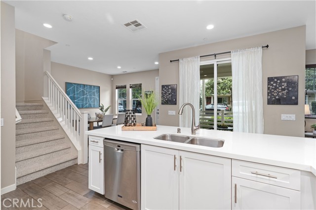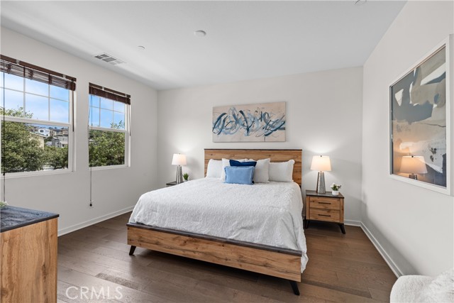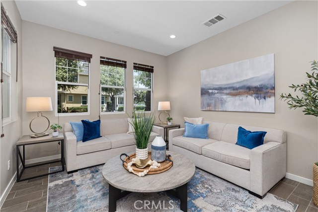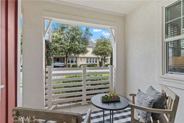 Welcome to your next home, nestled in the highly sought-after Aurora neighborhood of Esencia, Rancho Mission Viejo. The main level includes tile flooring throughout, a front-facing living room and dining room, and a kitchen with white shaker cabinets, quartz countertops, stainless steel appliances, and a peninsula with bar seating. A half bathroom with a pedestal sink is also on the main floor, along with direct access to both the front patio and attached garage. Upstairs are three bedrooms, including a primary suite with a walk-in closet, private balcony, and en-suite bath featuring dual sinks, a soaking tub, and a separate shower. Two additional bedrooms share a full hallway bath. A separate laundry room with a side-by-side washer and dryer and overhead shelf is also located upstairs. Situated in a friendly neighborhood, this home is conveniently located near local amenities including shops, parks, and the award winning schools, and transportation options. Come experience what life could look like in this inviting Esencia home.