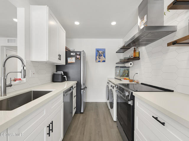 An amazing opportunity to lease this beautifully remodeled penthouse-style two-bedroom Village Green condo in the heart of Westlake Village. This desirable upstairs unit offers a private single-car garage and a spacious patio, perfect for relaxing or entertaining. Inside, the kitchen features quartz countertops, shaker-style cabinets, a sleek tile backsplash, stainless steel appliances, and an in-kitchen LG washer and dryer for added convenience. Fresh wood-like flooring and abundant recessed lighting create a bright, open feel throughout. Residents can also take advantage of the community's well-maintained pool and spa. Enjoy being moments away from shopping, restaurants, scenic greenbelts, and all the amenities that Village Green and Westlake Village have to offer.