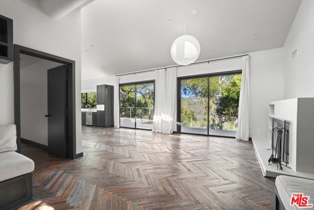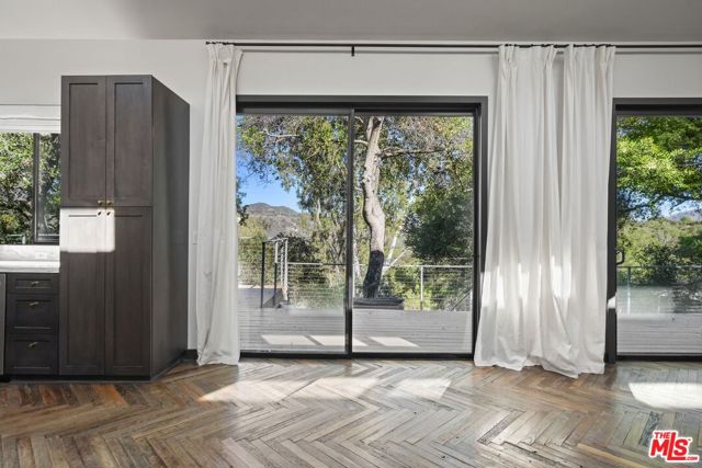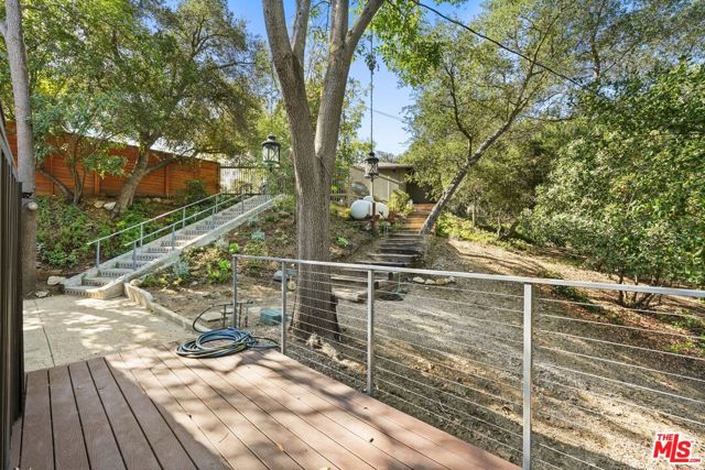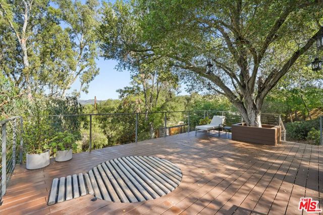 Designer Craftsman and Guest House. Perched atop a gentle rise within the coveted Entrada Stone Gates in Topanga's storied Post Office Tract, this bright canyon retreat captures the essence of refined rustic living. Reached by a private driveway and enfolded in ancient oaks, the home sits on nearly an acre of fully fenced, landscaped grounds, where nature and design coexist in perfect harmony. Expansive views spill across the horizon, framed by the silhouettes of mature trees and the shimmer of sunlight that filters through their leaves. French parquet wood flooring brings a timeless quality to the rooms. The open plan invites togetherness. The large, usable yard provides moments of quiet contemplation, and room to roam. Inside, the renovated main residence unfolds with an airy, open plan, three serene bedrooms, two elegantly refreshed bathrooms, and soaring, double-height ceilings capped with clerestory windows that invite light to dance across every surface. Vast glass windows dissolve the boundary between interior and landscape, creating a luminous canvas of sky, green, and golden warmth. The heart of the home, a spacious kitchen lined with long granite counters and stainless-steel appliances, feels both sculptural and functional. An integrated water filter, modern fixtures, and a generous washer and dryer make daily life effortlessly graceful. At the center of it all, a wood-burning fireplace anchors the living room, its quiet glow extending toward decks that stretch outward as freely as the home's spirit. The broad outdoor decks, equal in size to the home itself, host an open-air cedar spa sunken into the decking, poised to take in the sweeping canyon views. Lanterns strung among the trees flicker in soft choreography, their light controllable from within the home, casting an enchanting glow over evenings spent beneath the stars. Near the entrance to the property, a detached guest house offers a kitchenette and bath, and boundless flexibility, an inspiring creative studio, a welcoming suite for guests, or a peaceful office immersed in nature. The property's thoughtful features continue outward: a fully fenced yard, a large enclosed vegetable garden, a private pet yard, all nestled among the trees. The estate's modern fencing and gated back entrance provide both elegance and security, while professional landscaping, maintained and included in the rent, ensures that the grounds remain as pristine as they are poetic. This home's peaceful seclusion allows for mindful living attuned to Topanga's natural rhythms. Its nearness to the local cafes and shops, the beach, and just a short distance from the state park trails that wind through sun-dappled canyons, this home offers both retreat and adventure, a place where you can wander, dream, and create. It is a sanctuary of space and light, where modern comfort meets timeless tranquility, and every sunset over the hills feels like the day's final brushstroke.