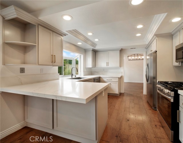 Tucked amid lush, mature landscaping, this beautifully reimagined pool home blends timeless design with modern elegance. Flagstone hardscape frames a custom gunite pool and spa enhanced by cascading water features, stacked stone accents, and a built-in fire pit with wraparound bench seating—perfect for entertaining or relaxing under the stars. Pella windows and French doors, rich wood flooring, recessed lighting, and plantation shutters reflect quality craftsmanship throughout. A welcoming formal entry opens to an airy layout where anewly remodeled chef’s kitchen—with new quartz counters, new appliances, a charming garden window, plentiful cabinetry, and a counter bar—flows seamlessly into the living area highlighted by a fireplace and backyard views. Cathedral ceilings in the living and dining areas create a bright, open feel while dual-pane French doors invite the outdoors in. Upstairs, the primary suite showcases vaulted ceilings and abundant natural light. The spa-inspired bath features a walk-in closet, dual sinks, slab granite counters, and a walk-in shower with dual shower heads and a built-in bench. The secondary bath offers double sinks, marble counters, and a shower-in-tub combination—beautifully updated for modern comfort. The home has also been fully re-piped for peace of mind. Additional highlights include plantation shutters throughout, a convenient laundry room, and a two-car garage. Enjoy Lake Mission Viejo membership with access to private beaches, boating, fishing, and summer concerts—all within a premier community served by top-rated Blue Ribbon schools.