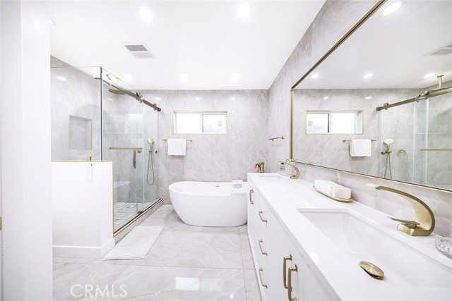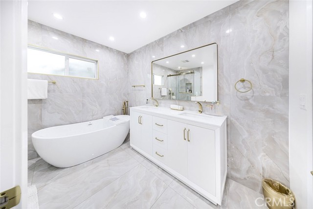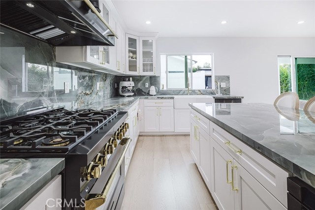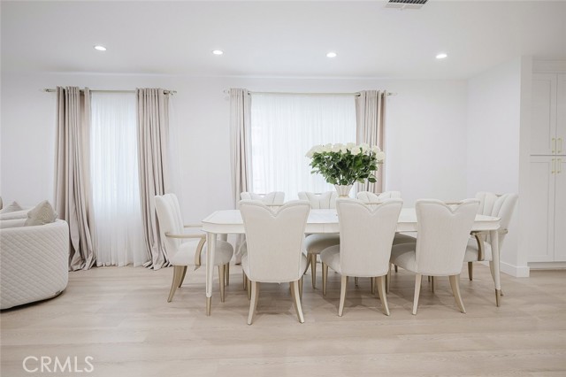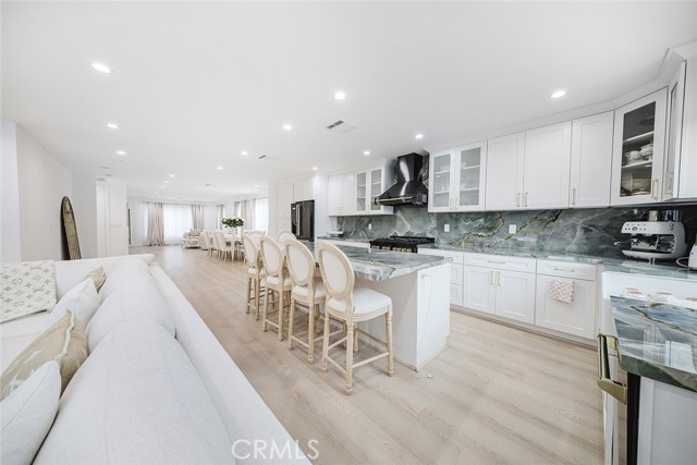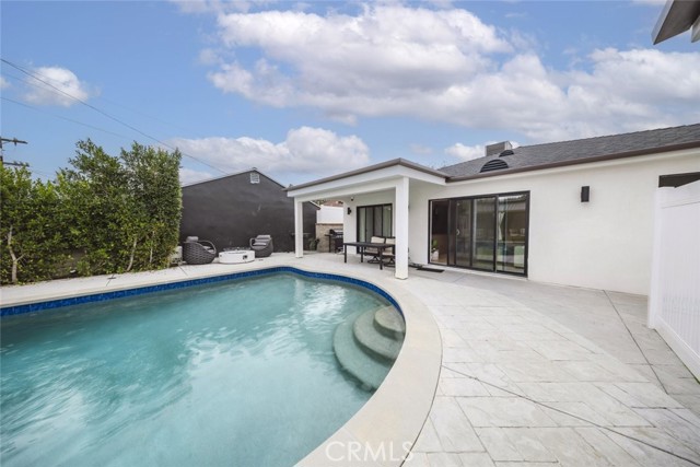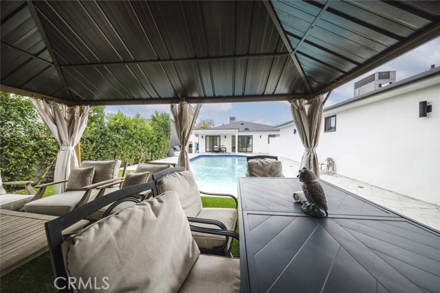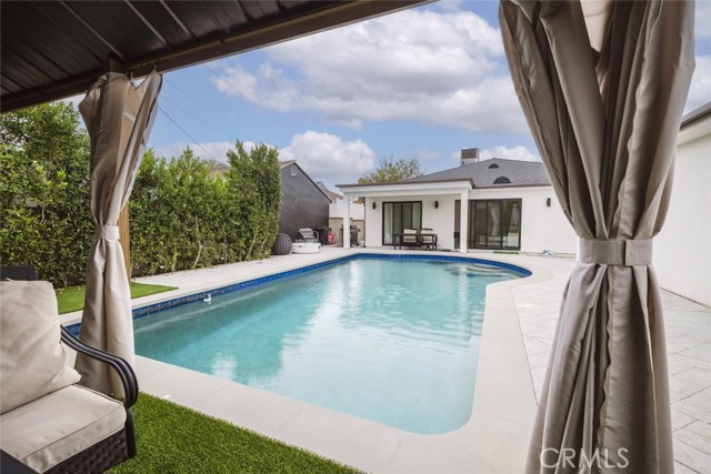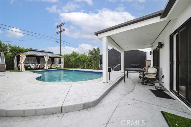Welcome to this stunning single-story home featuring 3 bedrooms, 2 bathrooms, and over 2,100 sqft of beautifully designed living space. Inside discover an inviting living room that flows seamlessly into the formal sitting area and dining space, perfect for entertaining. The remodeled kitchen is a showstopper with sleek white cabinets accented by gold hardware, high ceilings, recessed lighting, and all appliances included. The spacious primary suite offers a large walk-in closet and a spa-inspired ensuite bathroom with dual sinks, a white soaking tub, and a beautifully tiled shower. Each bedroom is generously sized, providing comfort and functionality. The backyard is a private oasis, complete with a sparkling pool and a charming gazebo, ideal for relaxing or hosting gatherings. This elegant home combines modern upgrades with resort-style outdoor living, truly a must-see!