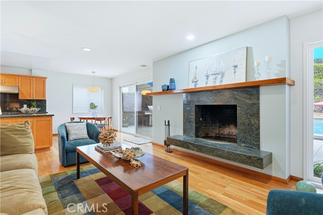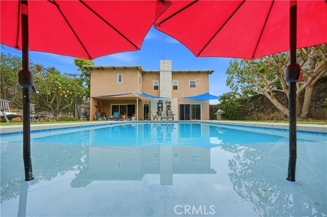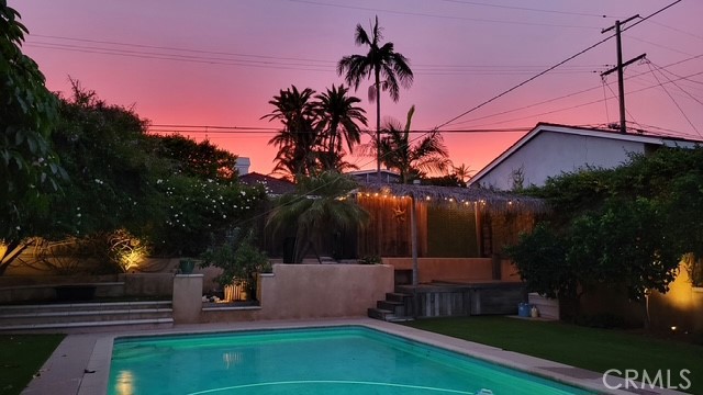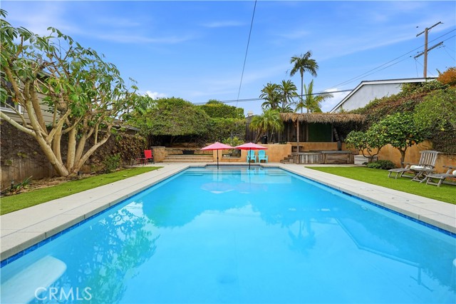Step inside this stunning Mid-Century Modern retreat in the heart of Belmont Heights! This beautifully designed home blends timeless architecture with effortless California living. The open floor plan offers distinct living, dining, and casual spaces — all centered around a dramatic fireplace and framed by large doors that open to the gorgeous backyard. The outdoor space is pure paradise. Recently remodeled, the sparkling pool features a Baja shelf for lounging in the sun. Surrounded by lush greenery, fruit trees, and a spacious lawn, this resort-style yard also includes a cozy fire pit, a tropical palapa, and multiple areas to relax or entertain — the perfect setting for weekend gatherings or peaceful evenings under the stars. Inside, light pours through oversized windows, highlighting high ceilings and gleaming wood floors. The chef's kitchen features stone counters, stainless appliances and a charming breakfast area overlooking the pool. The main level offers multiple living areas, a generous bedroom with vaulted ceilings and a renovated full bath — ideal for guests, a home office, or multi-generational living. Upstairs, you’ll find three additional bedrooms, including two that share a stylish Jack-and-Jill bath. The primary suite is truly a retreat — spacious enough for a sitting area, also with vaulted ceiling, dramatic windows and featuring a gorgeous updated en suite primary bath with a dual vanity, luxurious walk-in shower and a glimpse of the ocean beyond. The fully finished basement provides even more versatility — great space for an in-home gym, a studio, workshop or playroom — with direct access to the attached two-car garage that offers an additional storage room. Located just a short stroll from local schools, parks, restaurants, and the beach, this exceptional home combines comfort, style, and an unbeatable Belmont Heights lifestyle.