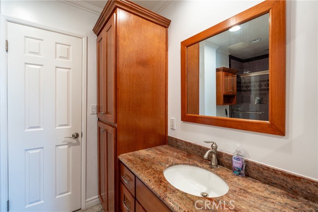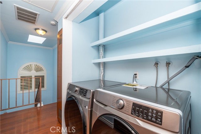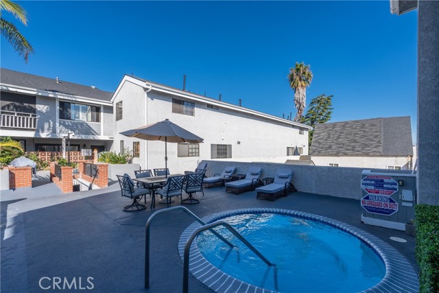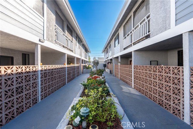Discover this beautifully upgraded spacious two-story townhouse, offering comfort, style, and exceptional functionality throughout. Step inside to find laminate wood flooring, crown and base moldings, plantation shutters, smooth-finished walls, recessed lighting, and double-pane windows that enhance energy efficiency. The home also features both air heating and air conditioning for year-round comfort. The cozy living room showcases a charming fireplace and a double-pane sliding door that opens to a private outdoor patio perfect for relaxing or entertaining. The kitchen is designed for convenience and durability, complete with solid wood cabinetry, Blue Pearl granite countertops, a double-door refrigerator, stove, dishwasher, microwave, water filtration system, and an additional side bar with extra storage. Upstairs, the primary bedroom includes a private covered balcony, a lighted walk-in closet, and an in-wall ironing board with electrical outlet. The spacious second bedroom features a top-of-the-line built-in Murphy bed, custom cabinetry, and a large lighted closet. Both bedrooms share a remodeled Jack-and-Jill bathroom. The upper level also includes ample linen storage and a dedicated washer/dryer area. A steel staircase provides access to a generously sized attic, offering even more storage options. The property includes two assigned parking spaces for added convenience. Community amenities include a Jacuzzi, patio area, and BBQ grill. Ideally located near shopping, dining, and the 405 freeway, this home combines comfort, upgrades, and convenience in one perfect package.
