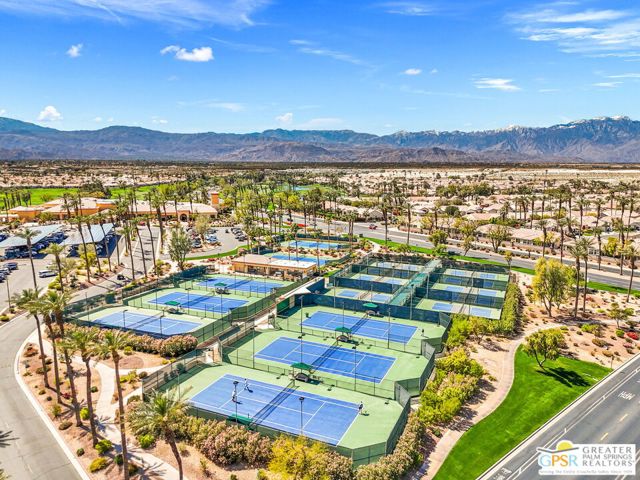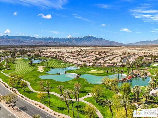 This ultra-private Sun City Palm Desert home, designed around the sought-after Portofino floor plan, sits gracefully on a wide, beautifully landscaped corner lot. Lush plantings wrap the property and create a gentle, retreat-like feel, especially around the pool with its relaxing waterfalls, welcoming firepit areas, and easy outdoor living spaces. A gated front walk and double-door entry open to tall ceilings and a warm, open-concept layout, where a stone fireplace with floor-to-ceiling built-ins anchors the living room and a coved ceiling brings character to the dining area. The kitchen is bright and comfortable with a skylight over the island, a walk-in pantry, and large windows framing views of the PebbleTec pool and spa, built-in BBQ with counter seating, and mountain backdrop. Three ensuite bedrooms offer wonderful separation, including an extended primary suite with dual fireplace shared with the living room, two walk-in closets, a bonus office or workout nook, and a spacious bath with skylight, dual vanities, and separate tub and shower. Guest suites rest on their own wing alongside a powder bath and utility room, plus an extended two-car garage with golf cart space. All of this is set within Sun City Palm Desert, a welcoming 55+ community offering golf, pools, fitness centers, pickleball, tennis, bocce, restaurants, clubs, activities, and low HOA fees that include cable and internet.