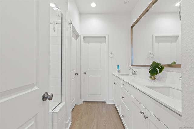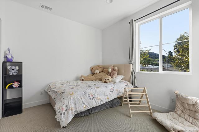 Built in 2020, this modern 4-bedroom home offers a bright, open floor plan with 9’ ceilings and vinyl plank flooring throughout. The spacious kitchen features a large island, granite countertops, stainless steel appliances, and an instant hot-and-cold water tap.Upstairs, the primary suite includes dual sinks, a walk-in closet, and beautiful sunset views. The convenient upstairs laundry room includes built-in storage and a folding counter. A whole-house fan helps keep the home cool while reducing AC use. Energy efficiency shines with included solar, dual-pane vinyl windows, and a Tesla charging station in the attached 2-car garage. Outside, the fenced-in patio is perfect for BBQs, lined with a fully producing passionfruit vine and offering stunning evening sunsets. Located on the outskirts of the community, this home provides extra privacy and ample guest parking right nearby. All of this in a peaceful neighborhood with a low HOA, just 5 minutes to the 52 and 125 freeways and 10 minutes to Costco, Target, Sprouts, Trader Joe’s, and more—within a top-rated school district. Move-in ready, stylish, private, and energy efficient—this home truly has it all.