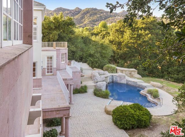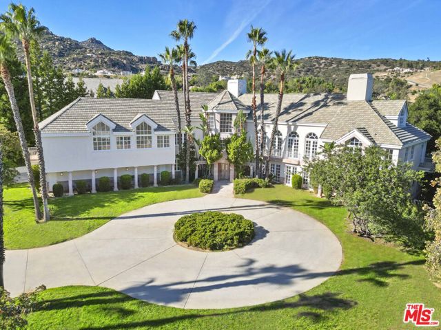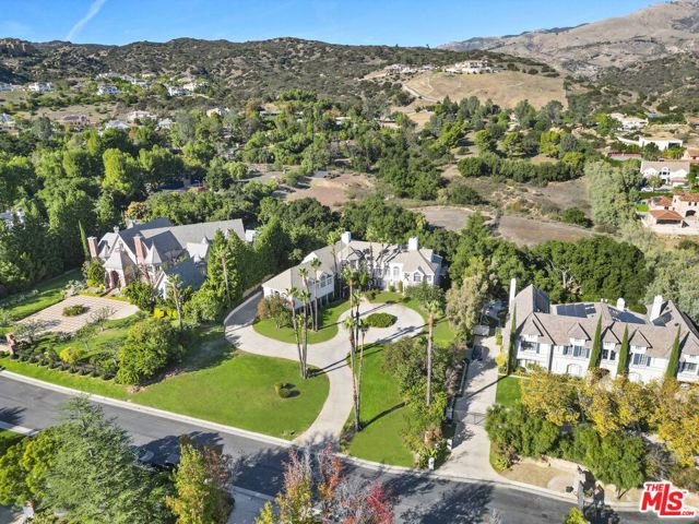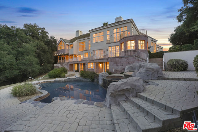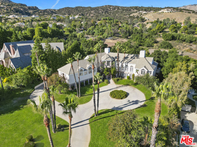 Presenting a home of notable distinction; an extraordinary post-modern architectural estate nestled within the exclusive, 24-hour guard-gated community of Indian Springs Estates. A rare sanctuary renowned for its commanding privacy and security, lifestyle of luxury and long-standing reputation as home to celebrities, sports figures, music moguls and high-profile professionals alike. Crowing a sprawling, over 2.6 acre lot the home is a destination, located behind the coveted 2nd gate and residing in divine harmony with its organic environment of mature trees, verdant greenery and spectacular Santa Susana Mountain backdrop. A sweeping circular driveway and expansive motor court set the tone for the home's impressive scale, leading to dramatic architecture defined by its bold, clean lines. Inside, grand volumes of space and massive use of glass and Neo-Palladian windows flood the interiors with natural light. Wood beamed ceilings soar above rich stone flooring with an open floor plan that provides gracious transition from room to room, optimally designed for easy, relaxed living and entertaining on a grand scale. Boundless views of the rolling hills and mountain range beyond are showcased through expansive view decks. A continuum of French paned doors bring the outdoors in and give way to a resort style setting with sparkling pool, spa and waterfall that embody the coveted Southern California lifestyle of endless al fresco leisure. Set against lush, mature landscaping enhancing the privacy of the grounds, a tranquil solitude abounds, elevating the living experience to new heights. An array of amenities include multi-use flex space bonus rooms including upper and lower level family and rec rooms with wet bars, walk-in closets, sauna, wine cellar, lux primary suite with private view deck and loft space and 4-car garage. Located in the Chatsworth Park Elementary Magnet school district and minutes from the premier entertainment, shopping and dining destination of The Vineyards, here is a rare and valued opportunity with unlimited potential to place your own design mark and create an iconic dream estate in one of the Valley's most prestigious communities. Welcome!