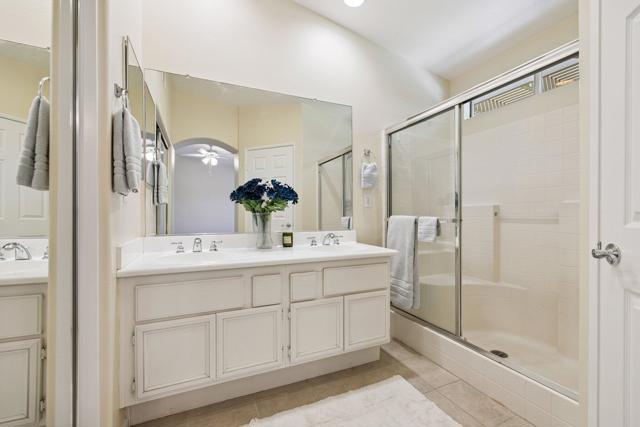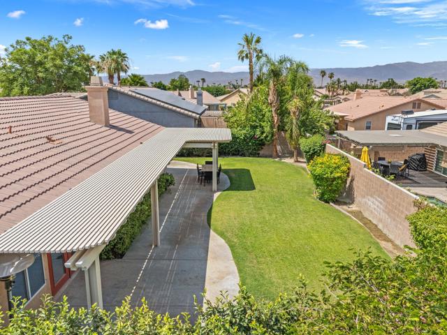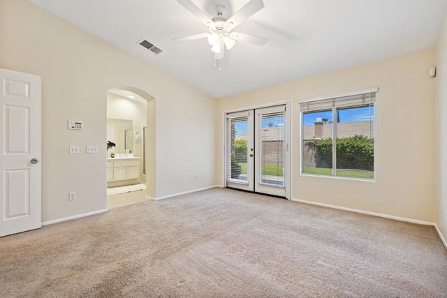 Enjoy the peace, quiet and security of gated Las Brisas N in this freshly painted 4 bedroom, 3 bath home with over 2000 sq ft. Expansive living area features high ceilings, formal dining room, living room, & family room with fireplace. Tile flooring separates family room from kitchen area with space in front of the island to add a casual dining table. Access to the backyard thru French doors allows a wonderful indoor/outdoor entertainment experience. Primary bedroom is spacious with access to the backyard thru it's own set of French doors. Ensuite bath has dual vanities, walk-in shower, & large walk-in closet. Down the hall there are two more bedrooms and a shared bath. The 4th bedroom and 3rd bath are located at the opposite end of the house near the kitchen and laundry room, perfect for guests or use as an office. The attached 2-car garage is conveniently accessed through the kitchen. Property is beautifully landscaped front & back. Lovely mature shade tree, grass, & verdant foliage in the front yard. The backyard has a concrete patio that extends the length of the house, pergola providing shade, and a huge grass expanse perfect to add a private swimming pool. Located close to Costco, shopping, medical, & downtown events. Low HOA fees.
