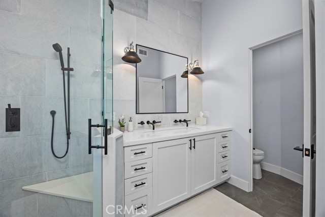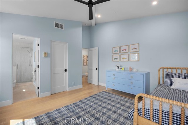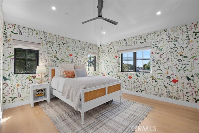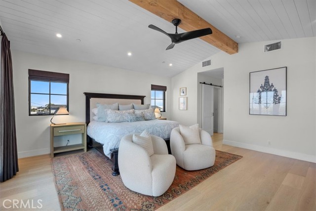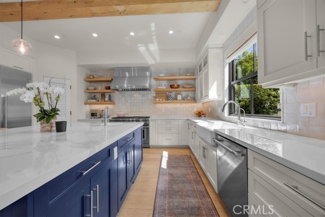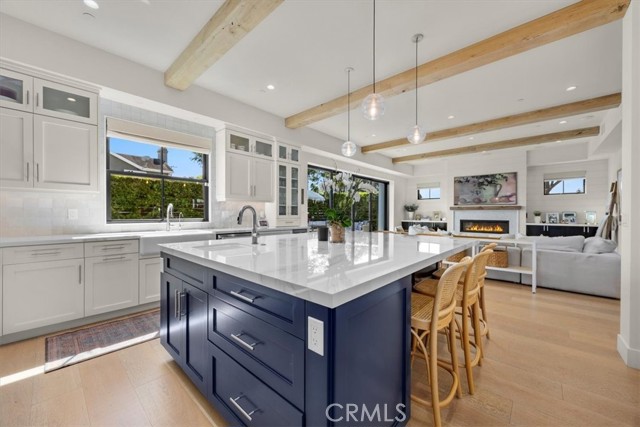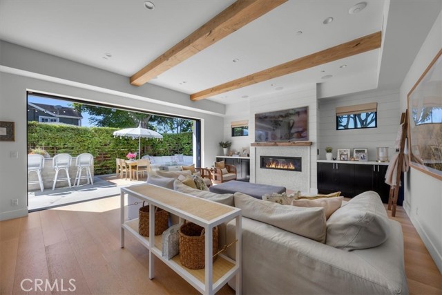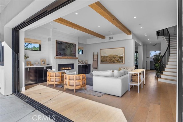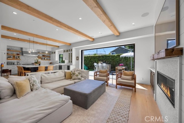 This exceptional five-bedroom, five-bath residence offers a seamless blend of indoor comfort and outdoor sophistication. Designed with timeless craftsmanship and thoughtful detail, the open layout flows effortlessly from welcoming living spaces to a serene backyard retreat. Created in collaboration with a decorator who previously worked closely with Nancy Meyers, the home captures that signature sense of warmth and layered refinement—spaces that feel both timeless and effortlessly livable. The family room features reclaimed wood beam ceilings, custom built-ins, and a striking fireplace, opening through concealed stackable sliders to an inviting outdoor lounge with a built-in BBQ, bar counter, and firepit-ready seating area. The professionally landscaped yard includes eco-conscious turf and a spacious play area—ideal for entertaining or relaxing in style. The chef’s kitchen is both functional and refined, anchored by a generous island with handcrafted cabinetry, floating wood shelving, designer tilework, and stone countertops. A walk-in pantry, beverage bar, and top-tier appliances—including a built-in beverage refrigerator—create an effortless flow between everyday living and entertaining. A light-filled living room with shiplap accents and a cozy fireplace extends to the covered front porch, while a custom built-in mud area and finished two-car garage add convenience. The main-level guest suite offers private outdoor access, perfect for visitors or a dedicated home office. Upstairs, the primary suite is a tranquil retreat with vaulted reclaimed-wood ceilings, a brick fireplace, dual custom closets, and a spa-inspired bath featuring a freestanding tub and walk-in shower. Each additional bedroom includes its own en suite bath and abundant natural light. Refined finishes include wide-plank hardwood floors, curated lighting, 10-foot ceilings, tankless water heater, upstairs laundry, and sustainable landscaping. Ideally located near award-winning schools, Polliwog Park, Manhattan Village, and the beach, this home embodies elevated design and effortless comfort.