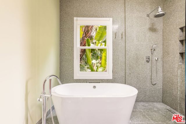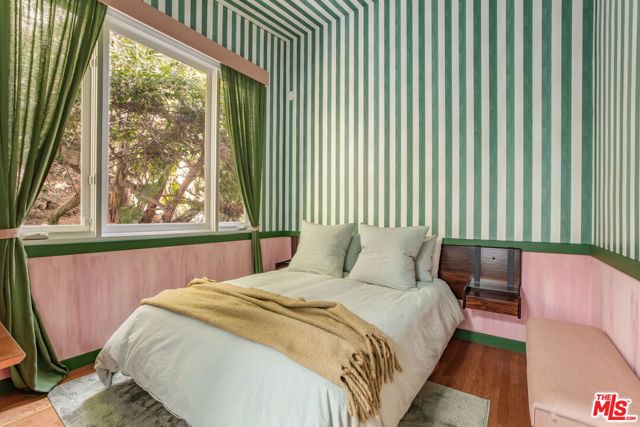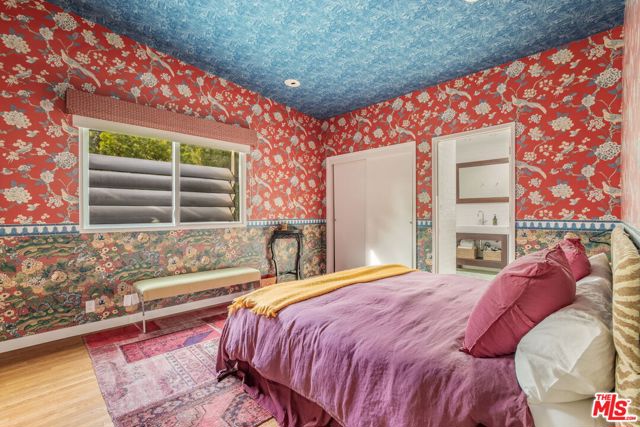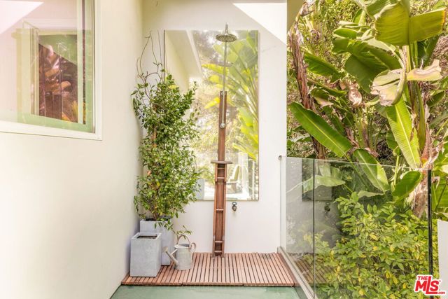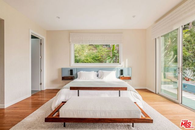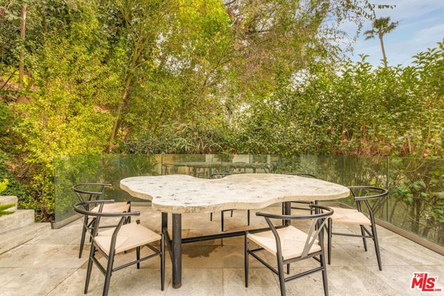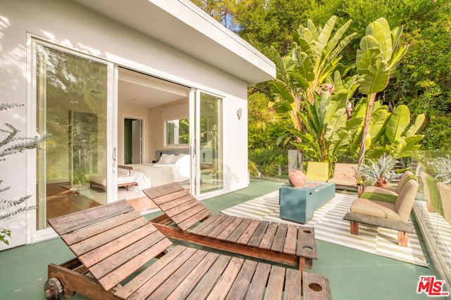 Perched in the coveted Bird Streets of the Hollywood Hills, this recently renovated mid-century home blends classic architectural lines with a warm contemporary sensibility. Stone tile floors unify the interiors with the outdoors, creating a seamless flow from the expansive great room to the lush terraces beyond. The well-appointed kitchen can be closed off for catered entertaining, ensuring effortless hosting. Tropical plantings and birds of paradise surround the property, enhancing the home's privacy and resort-like atmosphere. A vast outdoor terrace is just off the great room, with lounging and dining spaces framed by tiered tropical gardens. The street-to-street lot leads up to a covered outdoor pavilion, an inspiring setting for an art studio, exercise space, or peaceful retreat. Upstairs, four bedrooms include three with en-suite bathrooms. Hardwood floors add warmth to the bedrooms, while the primary suite opens to a sun-drenched, wraparound terrace that includes an outdoor shower. The home comes fully furnished with curated mid-century modern pieces, including a Jean Prouve window screen, Charlotte Perriand fixtures, and furniture by Ray and Charles Eames, Jorge Zalszupin, Geraldo de Barros, and Sergio Rodrigues. A fourth bedroom with a private entrance provides a perfect home office or client-facing workspace with direct outdoor access. This exceptional property offers architectural pedigree, sophisticated design, and a serene indoor-outdoor lifestyle in one of Los Angeles' most desirable neighborhoods. Available furnished for a 13-month lease.