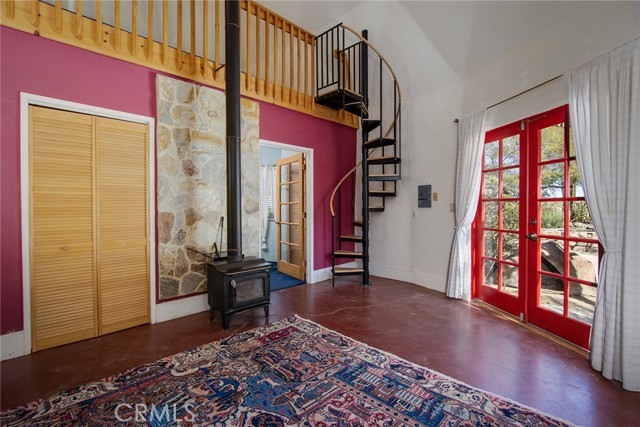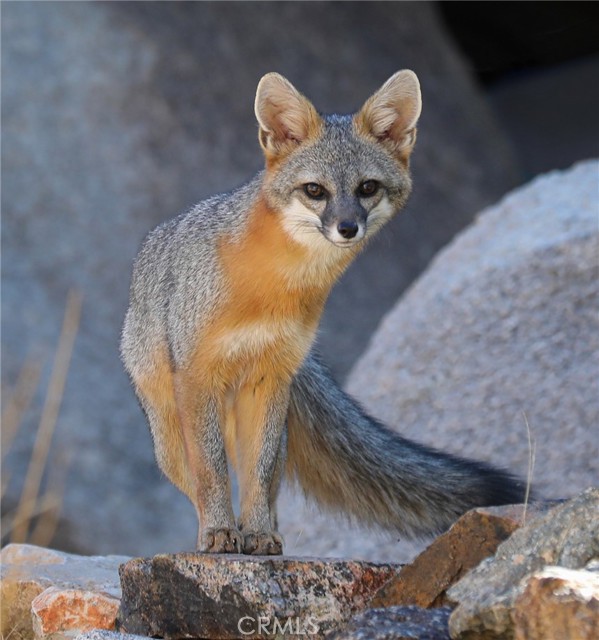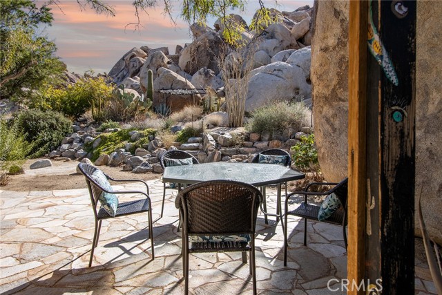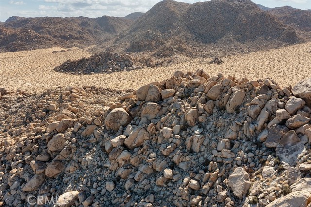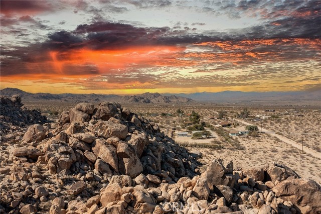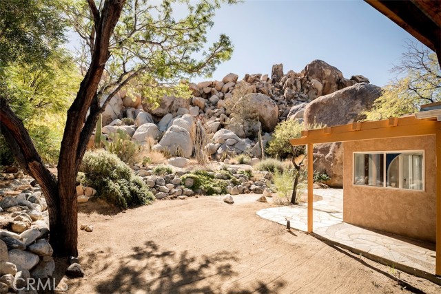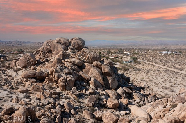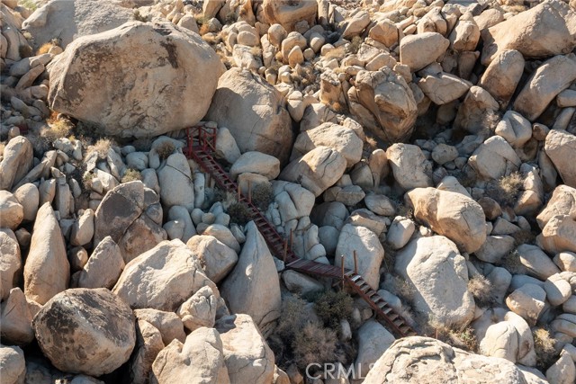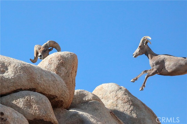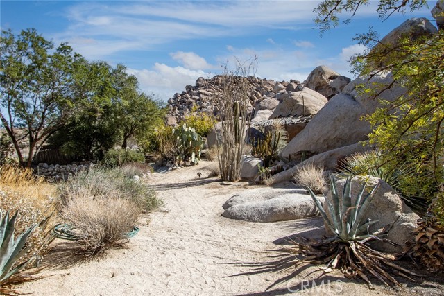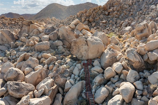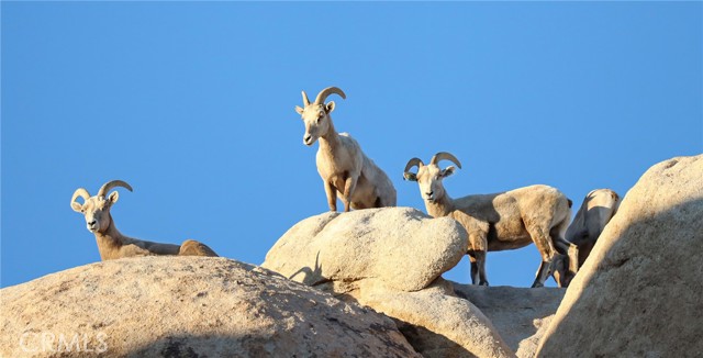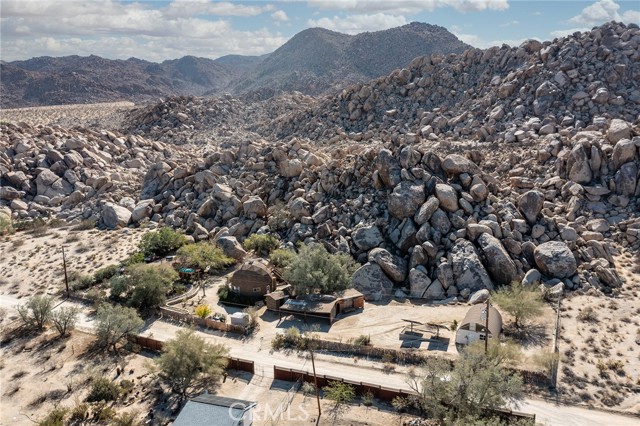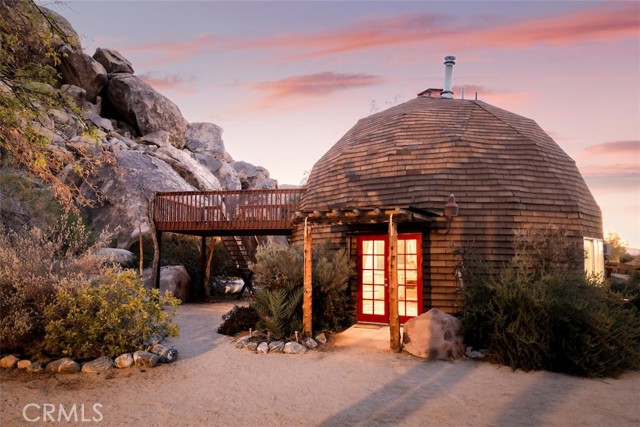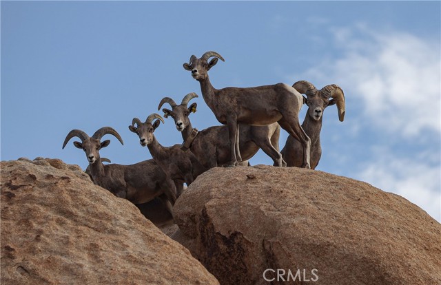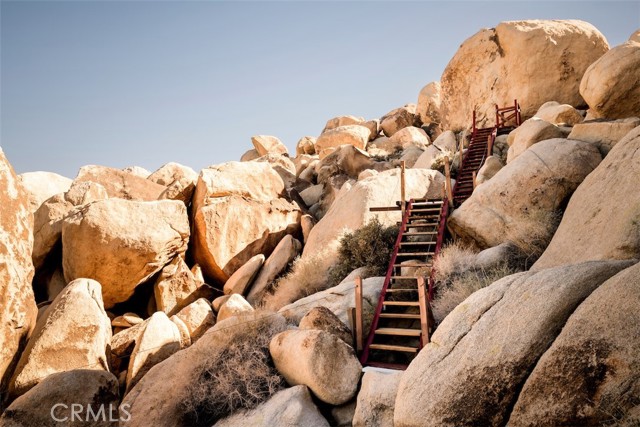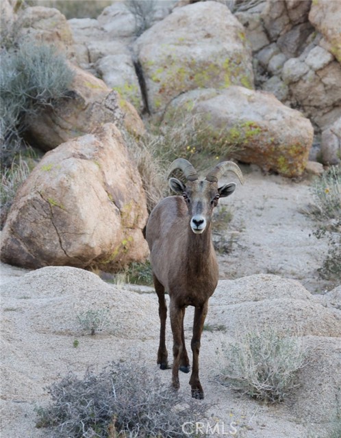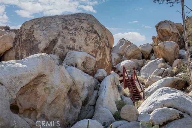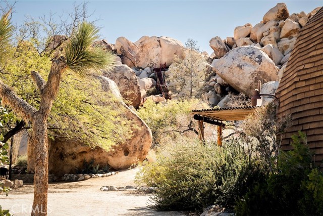 STAIRWAY TO HEAVEN: BOULDERS, BOULDERS, BOULDERS. Massive 10-Acre parcel that borders and is adjacent to Joshua Tree National Park. Hike from your own property straight into the Park – or better, camp in your own boulder retreat. Parcel is also adjacent to the Kellogg/Doolittle house – the most significant architectural home locally, which is built into the boulders and provides an example of future possibilities with this parcel. Property includes 3 separate living structures: a 2-bed/1-bath conventional home with a dining/living area that opens up to a boulder surrounded courtyard. A large 1-bed/1-bath geodesic dome with a loft bedroom and spacious living area, in addition to a second-floor deck to relax and enjoy nature. Finally, a modest 1-bed/1-bath cabin. Property is serviced by conventional electric and water (SCE & Joshua Basic Water District water meter) and septic tanks. For additional storage/workshop stands a Quonset hut, made from durable steel. A carport is built into the rocks. Paid solar. Wildlife flourishes on the property, including big horn sheep (all animal pictures were taken on the property). Few properties touch the National Park and even less are this large in size and this many rock outcroppings. One could lead private yoga retreats in your own private hidden valley, or meditate solo. Countless possibilities for a property as significant, profound and sublime as this extremely rare holding.
