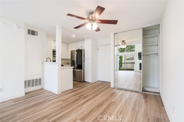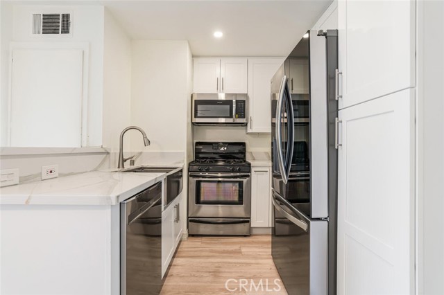 Remodeled Condo, Ready for Immediate Move In! A truly rare offering of this 1 bedroom, Top level condo away from busy street noise. From the moment you enter, you will notice the high vaulted ceilings and open and flowing floor plan. The location is close to the elevator and also features 2 assigned parking spots with easy access to and from the property. Upgraded finishes include: stainless steel appliances, remodeled kitchen, recessed lighting, wood flooring and remodeled bathroom with custom shower. Outside, you will find the balcony offers the perfect space to BBQ in the beautiful year-round weather that Woodland Hills has to offer. The Met, situated in the highly prestigious Warner Center, is an exclusive, guard-gated community spread across 26 acres of verdant grounds. The community consists of resort-style amenities including four pools, state of the art fitness center, six fully lit North/South tennis courts, children's playground, expansive poolside deck, indoor basketball court and racquetball court all while being minutes to local shopping, dining and entertainment in the heart of the San Fernando Valley. A true getaway that you can call home