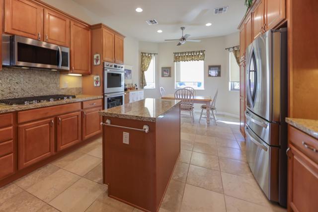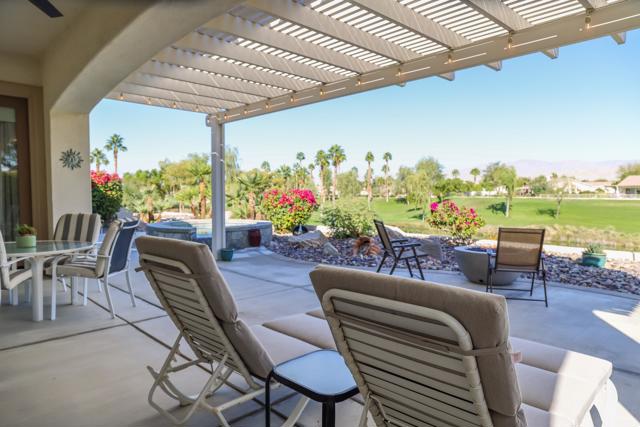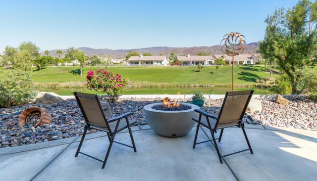 Enjoy stunning golf course, lake, and Chocolate Mountain views from this beautifully upgraded San Benito model, perfectly positioned on the 13th tee of the South Course in highly sought-after Sun City Shadow Hills Phase I. This spacious and thoughtfully designed home features 2 bedrooms, 2 baths, a den/office, and an additional bonus room, offering flexible options for guests, work, hobbies, or a quiet retreat. The open-concept Great Room showcases large view windows and flows seamlessly into the chef's kitchen, complete with slab-granite countertops, stainless steel appliances, a center island, double ovens, a breakfast bar, and a bright breakfast nook. Motorized shades in the Great Room, kitchen, and primary suite add comfort and convenience throughout. The primary suite is a private haven with backyard access, dual vanities, a soaking tub, separate shower, and an oversized walk-in closet, while the guest bedroom and bonus spaces provide versatility for a wide range of lifestyle needs. Step outside to a beautifully designed north-facing backyard oasis offering cooler year-round enjoyment, featuring a remote-controlled raised spa with water feature, a 2023 fire pit, extended Alumawood patio cover with hung lighting, and thoughtful landscape lighting that enhances evening ambiance. The lot orientation provides excellent natural protection from seasonal winds while capturing peaceful pond, fairway, and mountain views. Significant upgrades add comfort and efficiency, including new windows installed in 2020, an HVAC system approximately eight years old, motorized blinds added in late 2020, ceiling fans in every room including the bathrooms (installed in 2021), Corian window sills, and an air-conditioned attic for improved temperature control. The oversized 2-car plus golf cart garage is another highlight, featuring a 2021 mini-split A/C system, overhead storage, insulated doors, and plenty of room for tools or seasonal belongings. With panoramic views, carefully selected upgrades, and inviting indoor-outdoor living spaces, this home offers the perfect blend of comfort, quality, and resort-style living in one of the desert's most desirable 55+ communities.