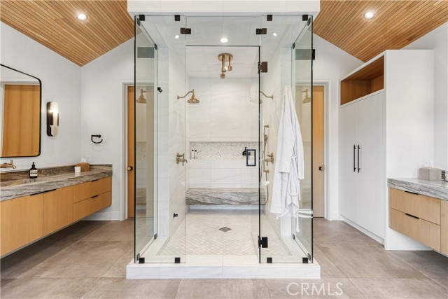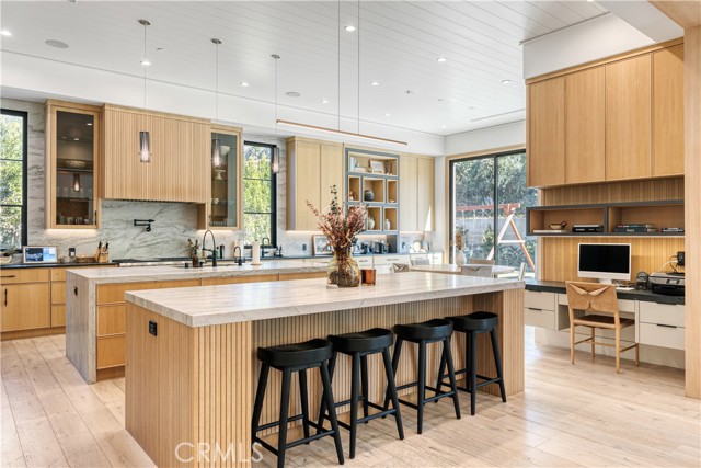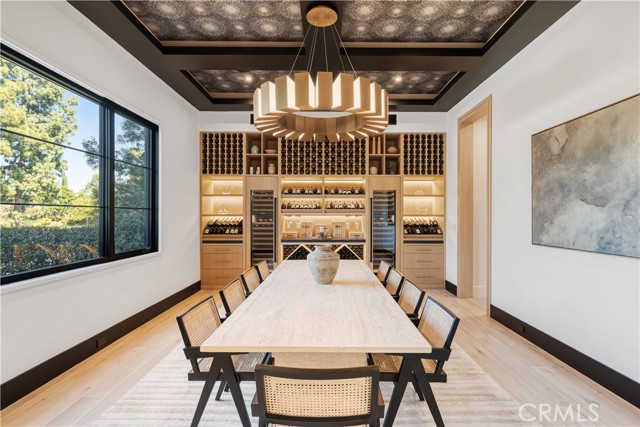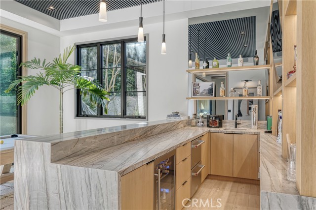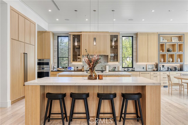 Welcome to this exquisite 5 bedroom, 7 bathroom estate, where modern luxury meets effortless sophistication. Nestled in prime Encino Hills on a tranquil cul-de-sac, this home is zoned for the highly sought after Lanai Elementary School. Thoughtfully designed with a timeless aesthetic, it features Venetian plaster, warm wood floors, custom finishes, and an open layout with soaring ceilings that enhance the sense of space and grandeur. The seamless indoor-outdoor flow leads to beautifully landscaped grounds, complete with a fire pit, BBQ island, and a sparkling saltwater pool and spa with a waterfall—an entertainer’s dream. The primary suite is a true sanctuary, offering a private fireplace, an oversized balcony, and a custom walk-in closet with an island. The spa like bathroom is designed for relaxation, featuring a soaking tub, dual sinks, and an enclosed glass steam shower. Each secondary bedroom is ensuite, boasting soaring pitched ceilings and elegant finishes. Designed for both luxury and convenience, this home includes a state-of-the-art movie theater, a stylish bar and game room overlooking the pool, and two laundry rooms. The chef’s kitchen is fully equipped with top-tier stainless steel appliances, a Wolf gas range, Sub-Zero refrigerator and freezer, double ovens, double islands, a walk-in pantry with an extra refrigerator, and a butler’s pantry. The formal dining room is a showstopper, adorned with designer wallpaper ceilings and complemented by a temperature-controlled wine cellar. Additional features include a Control4 Smart System, designer light fixtures, custom carpentry, and tankless water heaters. This exceptional property must be seen in person to fully appreciate its high-end details. Can also be sold furnished for a turnkey luxury experience.