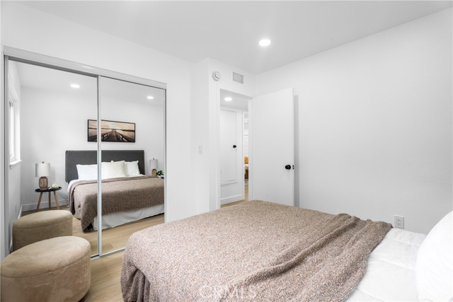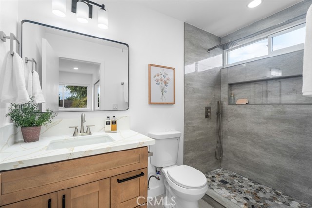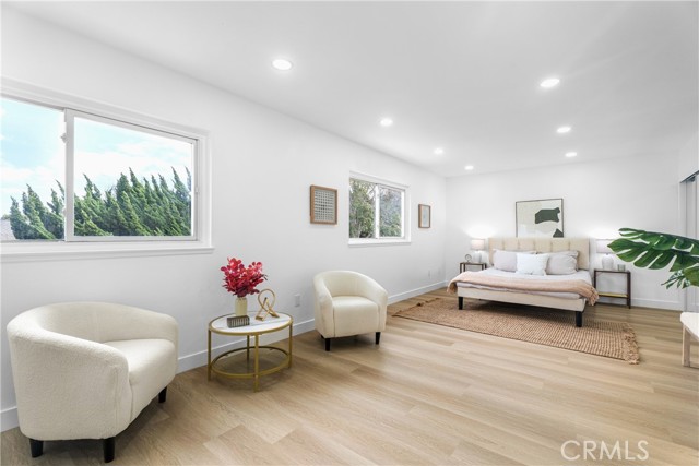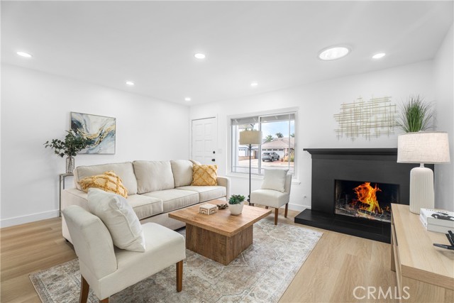 Walk to the beach! *Exquisite contemporary beach home with 2 MAIN floor bedrooms* TWO primary suites* Huge primary suite with a walk-in closet. You will fall in love! This exquisitely renovated coastal property offers a perfect blend of modern sophistication and timeless charm. Every detail has been meticulously crafted, boasting a top-to-bottom renovation that ensures luxury and comfort at every turn. The heart of the home is the stunning chef's kitchen, featuring sleek quartz counters, contemporary cabinetry, New sink, New fixtures, & New recessed lighting, & New stainless appliances. New wide plank waterproof laminate floors, double pane windows & sliders. New outlets, New baseboards, New paint inside & out. Scraped ceilings. All beds have mirrored closet doors. Stunning baths with New custom tile floors, walls, showers, rain shower heads, lighting, mirrors, & vanities. Custom living room fireplace built for those cozy nights after a long day of work! Large driveway that can fit up to 5 cars and 2-car attached garage. New mirrored closet doors in all bedrooms. It is the perfect spot for hosting family and friends! Both baths have been transformed into serene sanctuaries, showcasing designer finishes and elegant touches. Entertainment and relaxation await outdoors in the expansive private backyard, offering ample space for parties, entertaining, dining, gardening, or simply unwinding from your day. The front yard is equally inviting, adding to the home's charming curb appeal. Enjoy the cool ocean breezes and glowing sunsets year round in this quiet, highly sought-after coastal neighborhood just 2 miles from the ocean. Close to distinguished schools, Trader Joe's, Sprouts, Amazon Fresh, Bella Terra, scenic wetlands, trails, parks, Huntington Harbour, Meadowlark Golf Course, and of course, the stunning beaches of Surf City USA..
