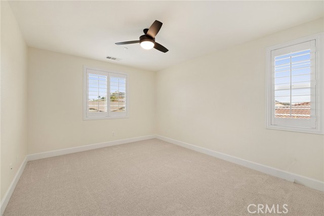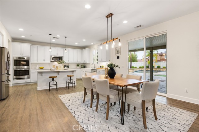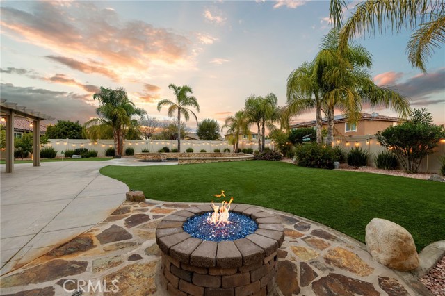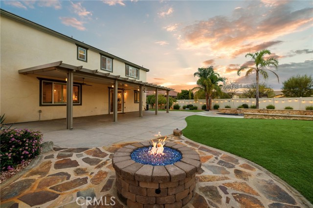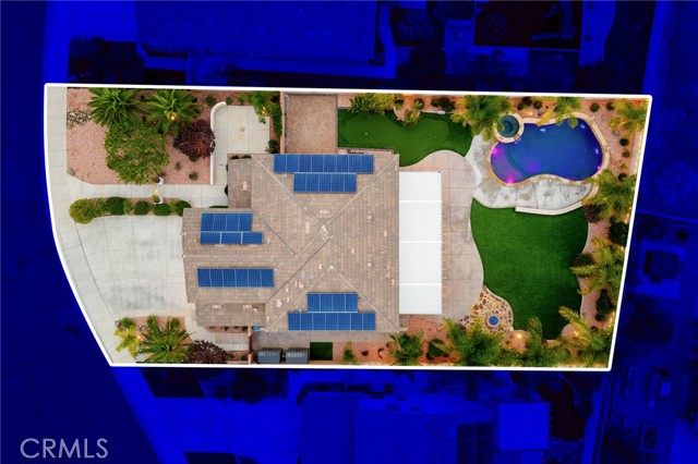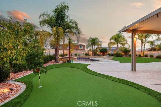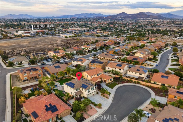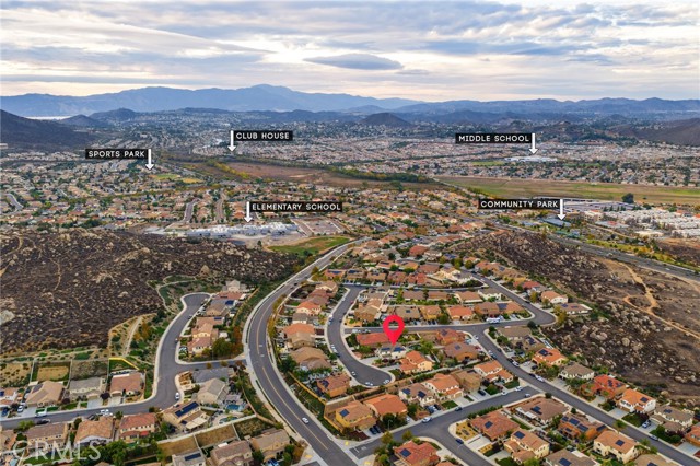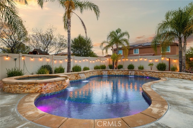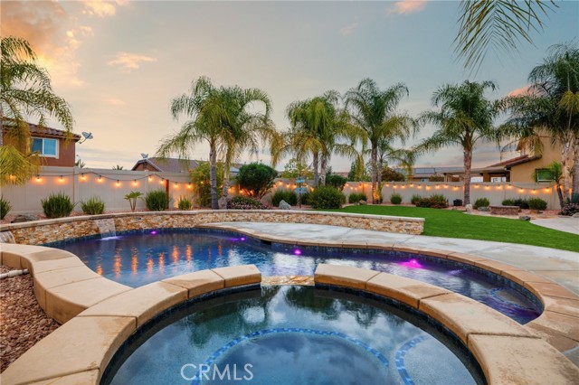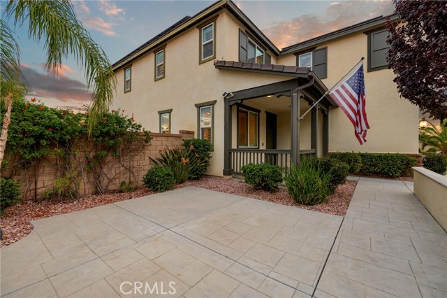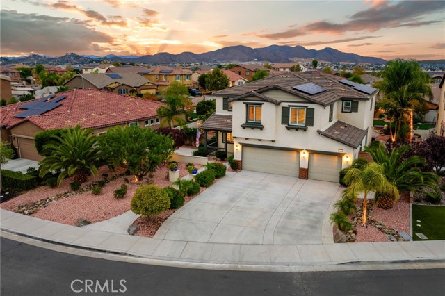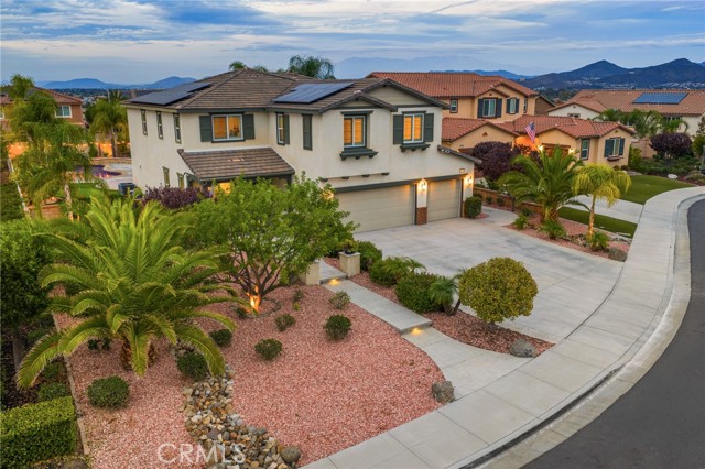Welcome home to Roundup Circle, located in the prestigious community of Audie Murphy Ranch in Menifee. This exquisite 5-bedroom, 4 bath property offers almost 3500 sqft of living space on over a quarter acre featuring a pool and spa, water softener, whole house water filtration, and owned solar on a cul-de-sac. The spacious front yard greets you with drought tolerant landscaping, an extra wide driveway, custom steps that lead to a large courtyard and quaint porch with gorgeous mountain views. As you enter the home you are greeted by tall ceilings, new interior paint, LVP floors, plantation shutters and a highly desirable floor plan. The living room offers tons of light flooding in from the large windows and flows right into the butler’s pantry boasting a wine fridge in the built-in cabinets situated across from the large walk-in pantry. The chef’s kitchen is appointed with quartz counters, double oven, 5 burner stove, RO water system, farm sink, newer dishwasher and fridge. The eat up island faces the large eating area boasting a custom chandelier and flows right into the Great Room. The spacious Great Room features a gas fireplace and the opportunity to build custom cabinetry. The main floor offers a spacious Junior Suite boasting new carpet and attached bath featuring a single vanity and walk-in shower. The second main floor bath is a powder room perfect for guests just off the entrance to the 3-car garage offering tons of storage. The second story boasts LVP floors, a massive loft, the three large secondary bedrooms, all featuring new carpet, gorgeous views and two of the three have walk-in closets. They all share a secondary bath boasting a dual vanity and shower tub combo. The upstairs laundry room boasts custom storage and wash sink. The oversized primary bedroom offers new carpet, plantation shutters, mountain views and an attached bath boasting a dual vanity, seating area, soaking tub, shower and large walk-in closet. The 13,000 sqft entertainers dream yard is appointed with stamped concrete, large aluma wood patio cover, artificial turf, gas fire pit, a putting green and a 2021 built pebble tech pool featuring a baja step, waterfalls, and large spa, with a built-in seating area. The community features pools, spa, club house, sports courts, skate park, trails, the new Kathryn Newport Middle school and award winning Taawila ES that is just feet from the home. The community is located between the 15 and 215 freeways, and super close to shopping.