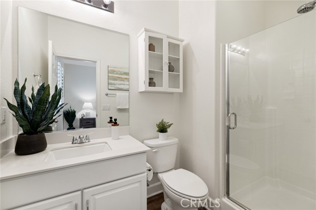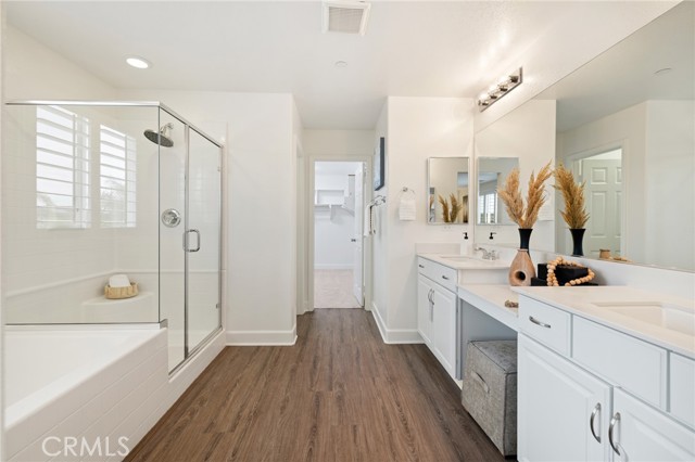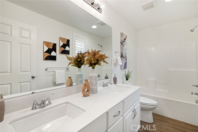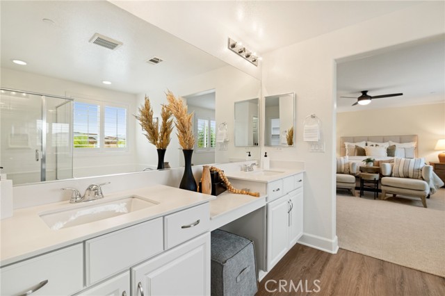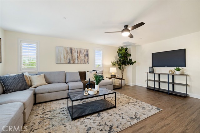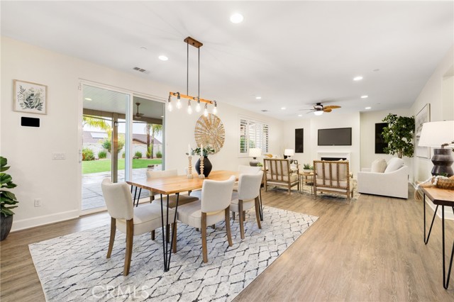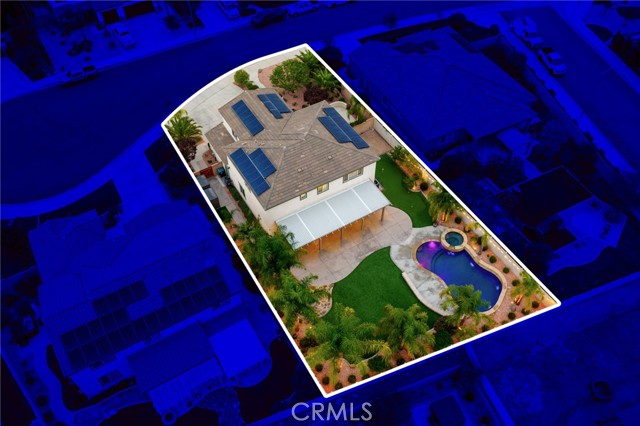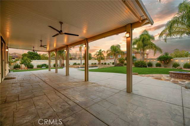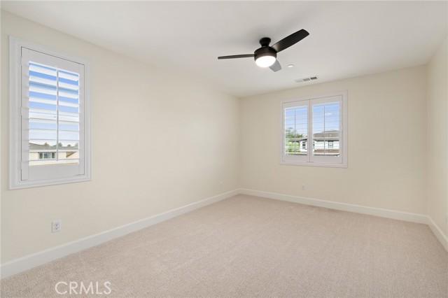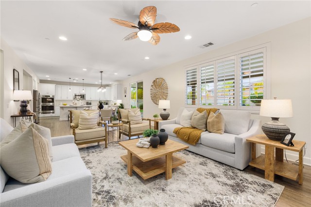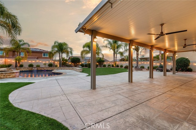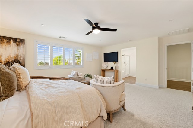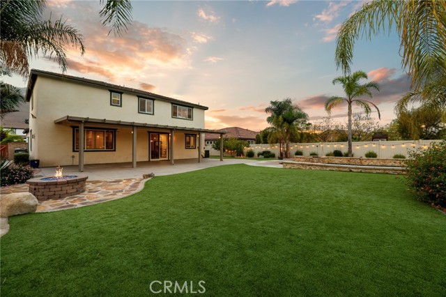 Welcome home to Roundup Circle, located in the prestigious community of Audie Murphy Ranch in Menifee. This exquisite 5-bedroom, 4 bath property offers almost 3500 sqft of living space on over a quarter acre featuring a pool and spa, water softener, whole house water filtration, and owned solar on a cul-de-sac. The spacious front yard greets you with drought tolerant landscaping, an extra wide driveway, custom steps that lead to a large courtyard and quaint porch with gorgeous mountain views. As you enter the home you are greeted by tall ceilings, new interior paint, LVP floors, plantation shutters and a highly desirable floor plan. The living room offers tons of light flooding in from the large windows and flows right into the butler’s pantry boasting a wine fridge in the built-in cabinets situated across from the large walk-in pantry. The chef’s kitchen is appointed with quartz counters, double oven, 5 burner stove, RO water system, farm sink, newer dishwasher and fridge. The eat up island faces the large eating area boasting a custom chandelier and flows right into the Great Room. The spacious Great Room features a gas fireplace and the opportunity to build custom cabinetry. The main floor offers a spacious Junior Suite boasting new carpet and attached bath featuring a single vanity and walk-in shower. The second main floor bath is a powder room perfect for guests just off the entrance to the 3-car garage offering tons of storage. The second story boasts LVP floors, a massive loft, the three large secondary bedrooms, all featuring new carpet, gorgeous views and two of the three have walk-in closets. They all share a secondary bath boasting a dual vanity and shower tub combo. The upstairs laundry room boasts custom storage and wash sink. The oversized primary bedroom offers new carpet, plantation shutters, mountain views and an attached bath boasting a dual vanity, seating area, soaking tub, shower and large walk-in closet. The 13,000 sqft entertainers dream yard is appointed with stamped concrete, large aluma wood patio cover, artificial turf, gas fire pit, a putting green and a 2021 built pebble tech pool featuring a baja step, waterfalls, and large spa, with a built-in seating area. The community features pools, spa, club house, sports courts, skate park, trails, the new Kathryn Newport Middle school and award winning Taawila ES that is just feet from the home. The community is located between the 15 and 215 freeways, and super close to shopping.