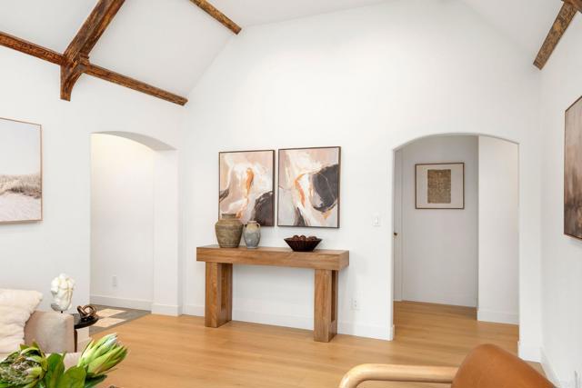 This luxurious, fully remodeled home delivers impeccable design, modern comforts, and cottage character throughout. Entering through an arched wood door, warm natural light fills the living room, where vaulted ceilings with striking exposed beams and a handsome fireplace create an unforgettable first impression, evoking the charm of a Tudor-inspired storybook home. The flow continues into a bright dining area that opens to a beautifully reimagined kitchen featuring custom cabinetry, sleek surfaces, wood-accented walls, and gleaming appliances, perfect for both everyday cooking and elevated entertaining. A peaceful primary suite and additional well-appointed bedrooms offer flexibility for guests, work, or creative spaces. Spa-inspired bathrooms showcase refined finishes, while a dedicated office nook and a spacious laundry room add everyday convenience. An inviting deck is ideal for morning coffee or evening unwinding. Beyond it stretches a generous landscaped backyard shaded by mature trees, an effortless extension of the living space. A large detached garage offers storage, parking, or potential creative use. Set in a treasured neighborhood celebrated for its wide streets, architectural charm, and strong community pride, the home enjoys proximity to beloved local cafés, parks, walking routes, and quick access to Culver City, DTLA, LAX, and the Westside. Come experience its charm in person!