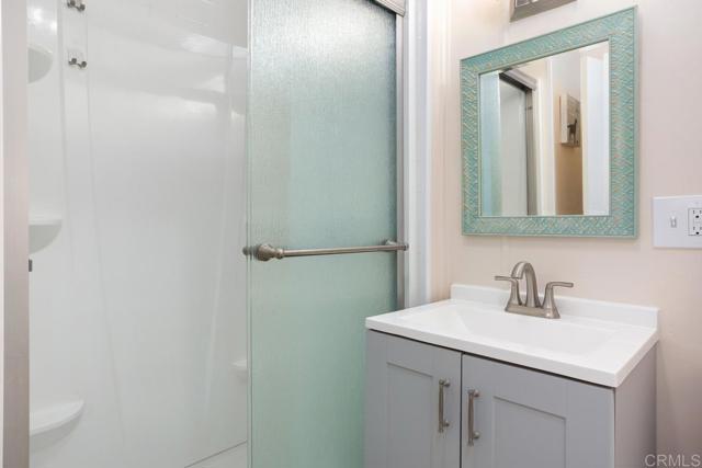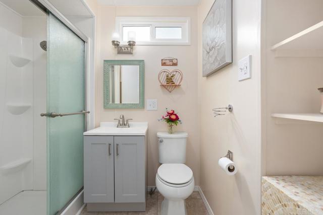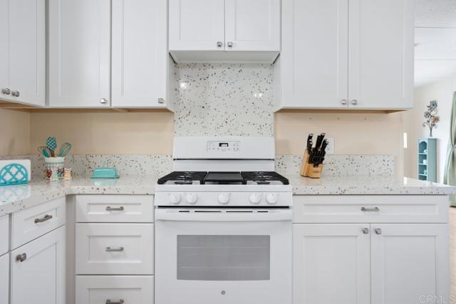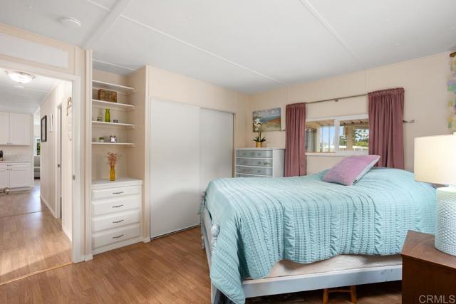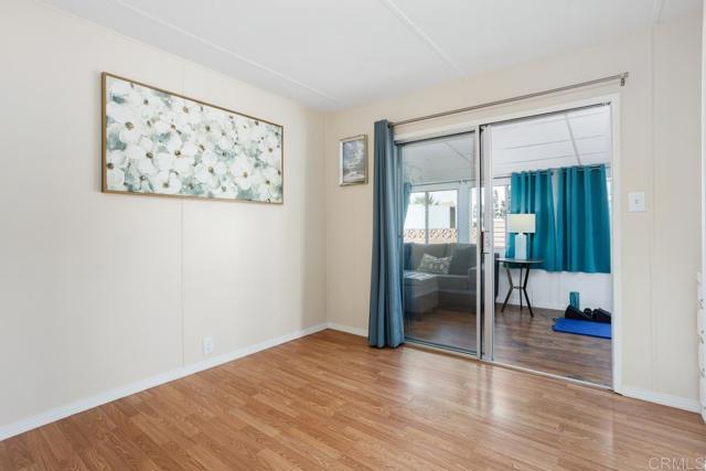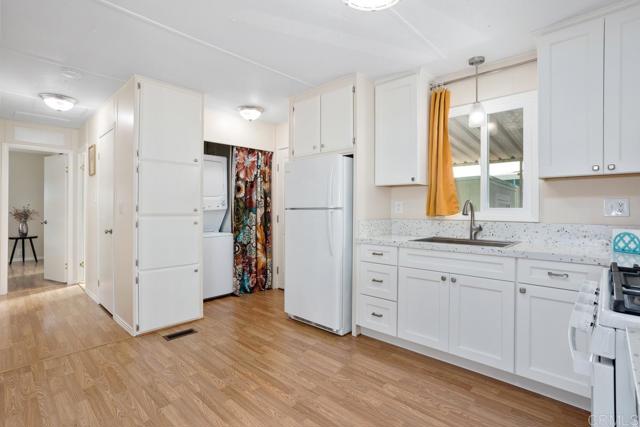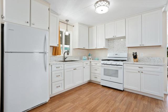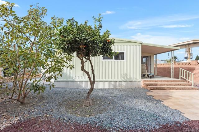 Nestled in a 55+/18+ community, on DMV registration with no property tax. Beautifully updated 2-bedroom, 2-bathroom mobile home offers comfort, space, and thoughtful upgrades throughout. The open-concept kitchen features soft-close cabinetry, quartz countertops, a modern sink and faucet, and a newer stove seamlessly flowing into the adjacent dining area and expansive living room—perfect for entertaining. Luxury vinyl flooring spans the home, complemented by linoleum in the bathrooms. The primary suite boasts a walk-in shower and an updated vanity, while the secondary bedroom opens directly to the large, enclosed sunroom—currently used as a cozy family room. The hall bath has been stylishly refreshed with a beautiful vanity and a tub surround. Additional upgrades include recently replaced electrical outlets and switches, light fixtures, fresh interior paint, updated door trim and baseboards, plus a stackable washer and dryer. The home is equipped with dual-pane windows, smoke and carbon monoxide detectors, and a newer water heater. The exterior has also been meticulously maintained, with fresh paint on both the home and storage shed, a resurfaced elastomeric roof (2022), and a new aluminum roof over the sunroom. Outdoor light fixtures and window screens have been replaced, and the spacious lot—with no neighbors on one side—features Haas avocado, orange, and lemon trees with a low-maintenance yard. Shed is 14' long x 7' tall x 7' tall. The property is conveniently located near shopping, restaurants, and a quick drive to the beach.