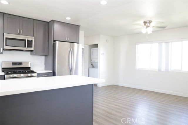 This is a spacious and bright two-bedroom, one-bathroom upper home on a quiet cul-de-sac street. It features vinyl flooring, stainless steel kitchen appliances, and an in-unit, stackable washer and dryer. The property includes two designated parking spots: one in a shared garage and a second space nearby.