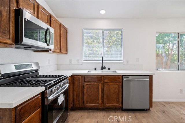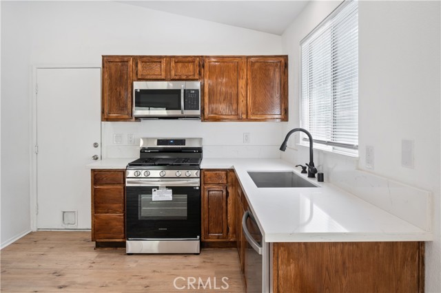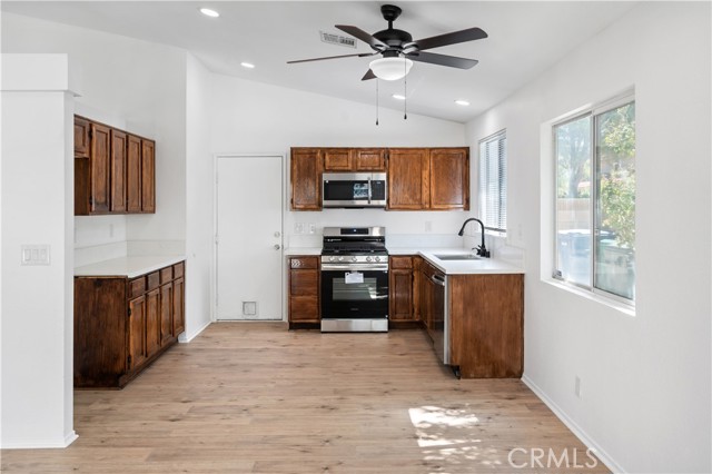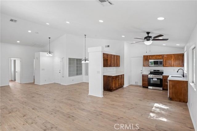 Build in 1994, One story remodeled 4 bedroom and 2 bath single family house located very convenient Westside of Rt 14, in Lancaster . The house featured 4 bedrooms, 2 bathroom at about 1588sf, and 2 car attached garages and back covered patio. Central AC/ Heating. High ceilings, Open and bright, remodeled with new kitchen quartz counter tops and appliances, new sinks and plumbing fixtures, beautiful wood cabinets, fans and Recess lights throughout. New wide Plank Vinyl Flooring. No steps inside house and no carpets inside house. No HOA and no HOA due to pay. The house is newly painted. It is a walking distance to Lancaster high School and Antelop Valley College, easy access to Rt 14, shopping and parks.