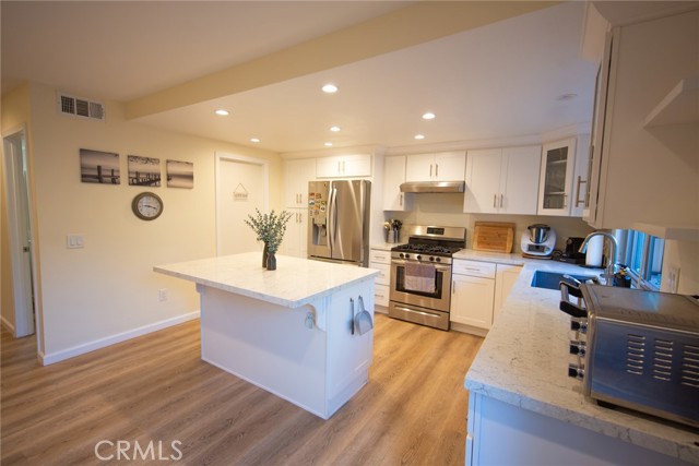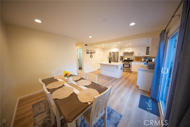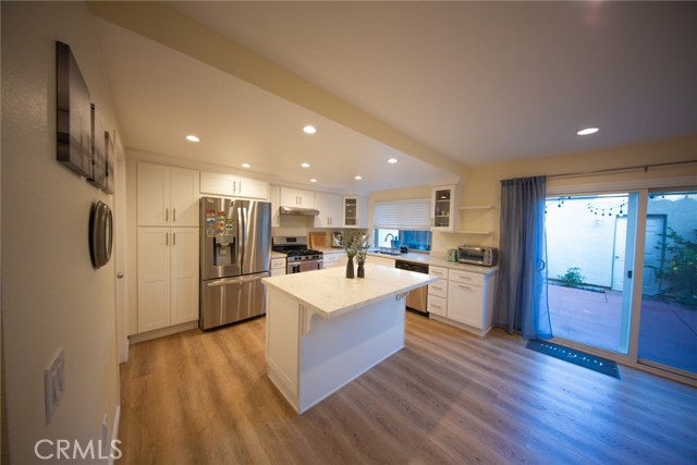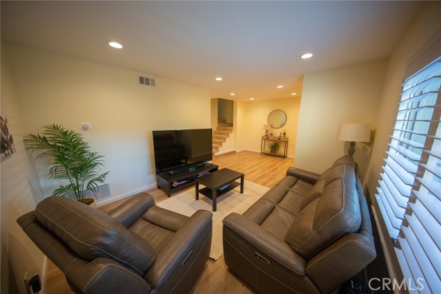 Discover this stunning, upgraded townhome in The Lakes community. This three bedroom, three bathroom residence showcases luxury vinyl tile flooring throughout, an inviting open living space, and expansive windows that bathe the home in natural light. LED recessed lighting adds a modern and warm ambiance in every room. The beautifully redesigned gourmet kitchen features Quartz countertops, white shaker cabinetry, premium stainless steel appliances, and an oversized eat in island that is ideal for cooking, hosting, and gathering. Just off the kitchen is an indoor laundry room with a walk in pantry and a dedicated dining area. All bedrooms are located upstairs. The primary suite offers a private patio retreat along with a beautifully finished en suite bathroom. The two additional bedrooms are spacious and share a tastefully appointed bathroom. A guest half bath is conveniently located on the main level. A charming courtyard style patio connects directly to the attached two car garage. The community offers an impressive array of amenities including a pool, clubhouse, BBQ areas, tennis courts, and tranquil lake access where you can take peaceful strolls or enjoy a paddleboat ride. Set within a quiet and secure neighborhood with plenty of street parking, this property also provides easy freeway access and is just a short drive from Orange County. This move in ready home is waiting for its next proud owners.
