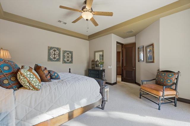 Welcome to an exceptional 3 bedroom, 4 bath, 2,975 sq. ft. residence offering unmatched desert living with spectacular views overlooking the 15th fairway and tranquil lake with mountain views. This home delivers on comfort - with large guest rooms/ensuites, attached casita with private entrance, soaring ceilings, large closets and plenty of privacy for everyone. It provides a beautiful blend of luxury, comfort, and resort-style amenities throughout.The backyard is a majestic outdoor oasis, designed to create a truly unforgettable experience day or night. Enjoy a sparkling pool and raised spa surrounded by custom fire pots, ambient tiki torches, and a cozy courtyard fireplace. The highly upgraded outdoor kitchen is an entertainer's dream, featuring Lynx BBQ, PIZZA OVERN, ICE MAKER, and REFRIGERATOR with generous prep space--perfect for hosting gatherings under the desert sky.Inside, the open-concept living spaces are warm and inviting, with custom fixtures, stacked stone and thoughtful upgrades throughout. The gourmet kitchen boasts Viking appliances, an expanded island, and upgraded stone countertops, offering both beauty and functionality. A fabulous bar with a custom wine room adds a sophisticated touch and creates an ideal setting for memorable evenings with family and friends.The home has been enhanced with modern conveniences including newer AC units and water heater, epoxy garage floors, and elevated finishes in every room.Offering panoramic views, luxurious upgrades, and an incredible indoor-outdoor lifestyle, this home truly captures the essence of desert resort living. A rare opportunity to own a meticulously maintained and beautifully upgraded residence in a premier location.