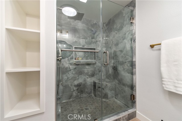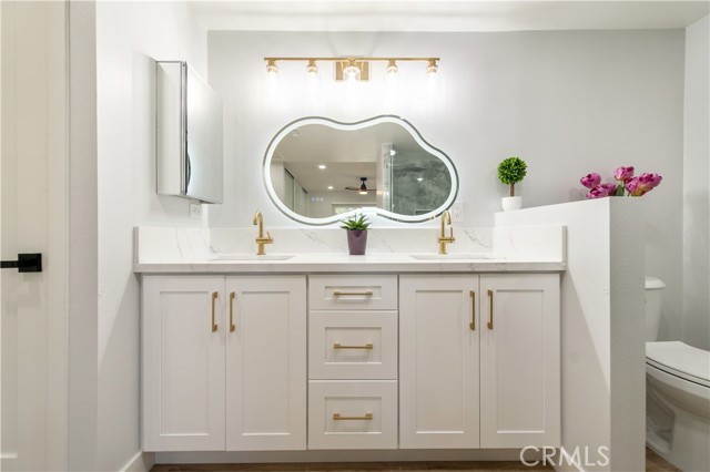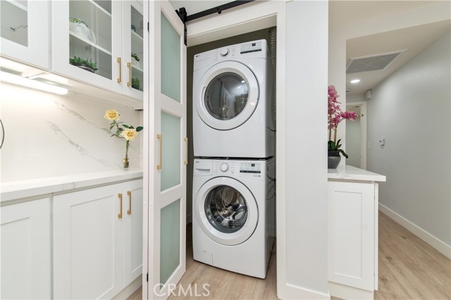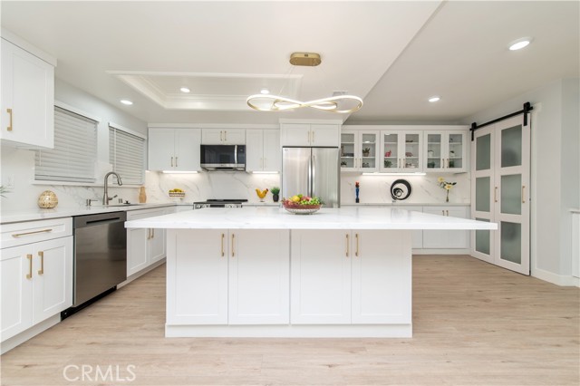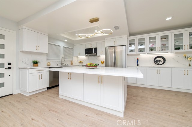 Step into a beautifully reimagined Casa Linda residence where every detail has been thoughtfully curated to create an atmosphere of comfort, function, and modern elegance. The moment you enter, the home unfolds into an open, light-filled living space anchored by a striking chef-inspired kitchen—an impressive gathering point with its expansive island, sleek quartz surfaces, and custom cabinetry accented in warm gold tones. Just beyond, the living room invites relaxation with soft natural light from overhead skylights, an architectural beam adding character, and a contemporary fireplace framed by built-ins. Large sliding doors draw you toward a peaceful covered balcony, extending the living space and offering a serene spot to unwind. A subtle reconfiguration of the floor plan enhances privacy between the two bedrooms, creating a thoughtful separation ideal for guests. Both bathrooms feel spa-like, showcasing refined finishes, generous walk-in showers with bench seating, and elegant lighting that elevates the everyday routine. The primary suite serves as a restful retreat with its custom-organized closet and modern sliding doors that blend seamlessly into the home’s clean, updated aesthetic. Throughout the residence, careful upgrades—smooth ceilings, double-pane windows, luxury vinyl plank flooring, new interior doors, recessed lighting, and central air—contribute to a fresh, cohesive environment. A discreet barn door reveals a full-size laundry area, maximizing both style and efficiency. With no stairs to navigate and a carport conveniently located on the same level, this home offers ease of living in one of Laguna Woods Village’s most desirable locations.