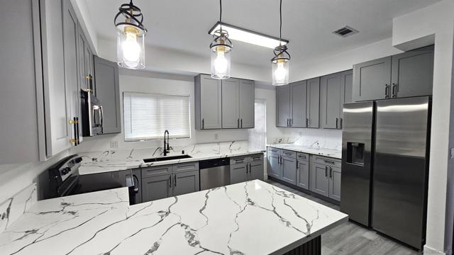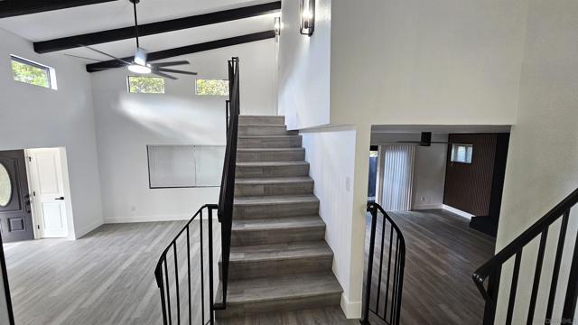 Complete Remodel! Beautiful 4 bedroom, 3 bath with swimming pool! Grand entrance features cathedral beamed ceilings and wonderful natural light. Large family kitchen with lovely peninsula, pendant lighting, ample cabinets, and lovely quartz countertops. Large dining room, separate living room, family room with fireplace and more. Primary bedroom with en-suite and walk-in closet sits up above all. 3 additional large bedrooms and a second full bath make this ample 2200 sqft home perfect for all. Fully fenced and gated lot, large front yard with decorative fountain, large tiled patio with pergola, gated parking, solar panels, and mature fruit trees. This home has it all. Additional photos coming soon!