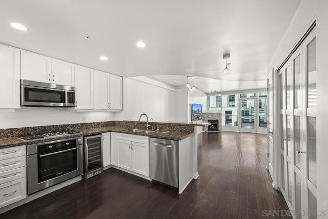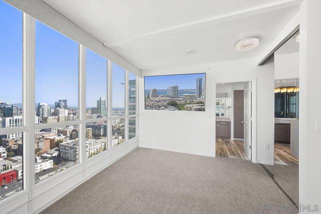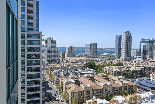 Perched high above the city on the 22nd floor, this sophisticated northeast corner residence at Horizons captures panoramas of the bay, ocean, city skyline, and even distant mountaintops. Expansive windows flood the space with natural light, perfectly framing the ever-changing scenery, while the private balcony—accessible from the living area and both bedrooms—offers a front-row seat to San Diego’s dazzling skyline. Inside, the open and airy floor plan is designed for both comfort and style. Gleaming wood floors extend through the living area, where an ambient fireplace adds warmth and charm. The entertainer’s kitchen is a showstopper, featuring stainless appliances, granite countertops, freshly painted cabinetry, recessed lighting, and a built-in wine chiller. Retreat to the primary suite, where stunning views, and direct balcony access. The spa-inspired ensuite bath elevates relaxation with a dual vanity and a step-in shower adorned with exquisite mosaic tile. The second bedroom, also with balcony access, is ideal for guests or a home office with a view. Complete with two parking spaces and a dedicated storage unit, this fully turnkey residence offers effortless upscale living. Experience the best of the Marina District’s premier high-rise—where sparkling city lights and endless blue water views become part of your everyday life. The Horizons boasts an unbeatable location in the Marina District, placing you steps from the New Children’s Museum, the scenic Martin Luther King Jr. Promenade, and Seaport Village. And with both a children's park and a dog park right behind the community, fun is always within easy reach for kids and furry friends alike. Resort-style amenities include a pool, spa, fitness center, concierge, security, billiard room, conference room, and guest parking. Convenience is built in, with an array of retailers just an elevator ride away—a bank, tanning salon, dry cleaners, Postal Annex, and a coffee/sandwich shop. Plus, you're within walking distance of bus and trolley lines, top-rated restaurants, shopping, and a 24-hour Ralphs Signature Market just around the corner.