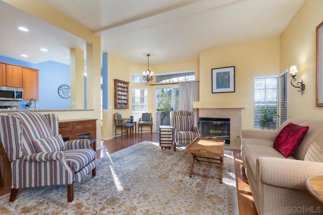 Bright and inviting 2-bedroom, 2-bath first-floor home in Belsera with 10’ ceilings and solid-surface floors through much of the space. Living room offers a cozy fireplace and smooth flow into dining area and updated kitchen with brand-new stainless appliances. Primary bedroom includes a walk-in closet and en-suite bath with double-sink vanity. Second bedroom works well for guests or a home office. Updated kitchen and main bath add to the move-in-ready feel. Attached 1-car garage, assigned parking space, and nearby guest parking provide convenience. Belsera amenities include pools, spas, volleyball court, and BBQ areas. Walking trails, nearby shops, and local restaurants support an easy outdoor lifestyle in Tierrasanta.