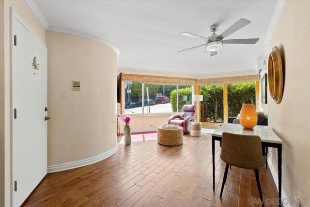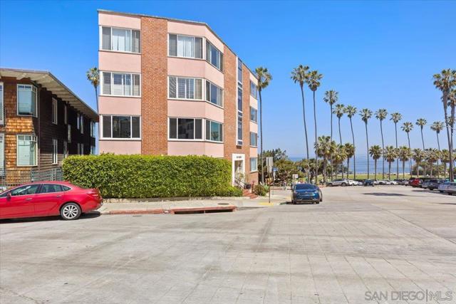 Spectacular location, in the heart of La Jolla Village, this perfectly situated, first floor condominium is just steps from renowned restaurants, boutique shops, world class art galleries and a multitude of coastal attractions. Stepping inside the architecturally unique, curvilinear entry way you are immediately greeted by the open concept living, dining, kitchen, great room with sliding doors that lead you to the common patio/garden space, surrounded by tall ficus trees for privacy. Living space features wall-to-wall picture window to enjoy your quintessential La Jolla coastal views, including the iconic La Valencia Hotel, and the classic palm tree lined Coast Walk that graces Ellen Browning Scripps Park, all of this plus views of the blue Pacific Ocean all the way up the coast past the bluffs of Blacks Beach. Large windows in each room let in the natural sunlight. Hardwood flooring in the main areas and carpet in the bedrooms. Kitchen features stainless appliances, dual corner sinks, electric stove, and spacious pantry. Stacked washer and dryer in unit. 2 mini-split systems for immediate cooling and heating, and an additional 3 ceiling fans. Don't pass up this opportunity to be on a vacation 24/7, 365 days a year!