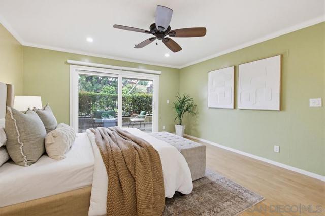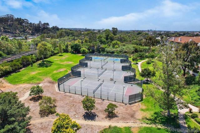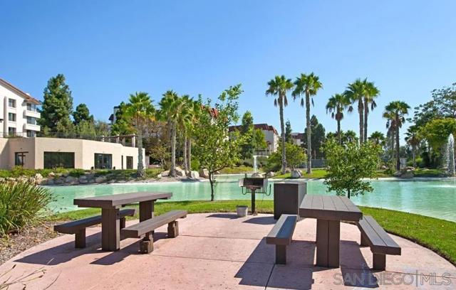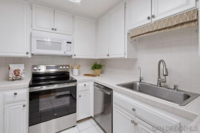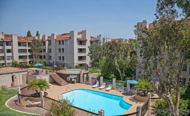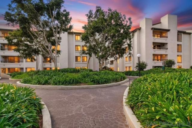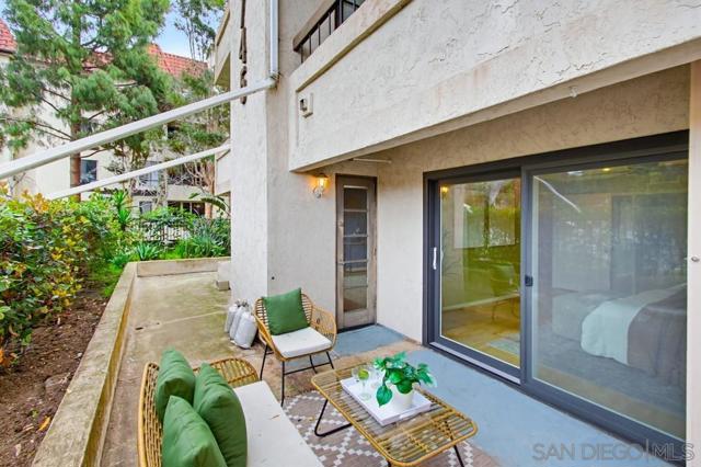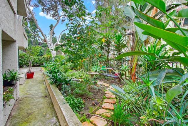 Lush garden end unit location in Presidio Place! This 1st floor one bedroom condo is the larger floorplan at 854 sq ft & features the additional half bathroom. Corner unit that provides extra privacy & a wrap around garden for peaceful views from all the windows. Large living room with space for a dining table, a fireplace & direct access to the patio. The bedroom has a slider to the patio & large vanity space/sink with an additional sink/vanity inside the main bath area. The open kitchen has lots of storage & a breakfast bar. Upgrades include: newer dual pane vinyl windows/slider with blinds, new refrigerator, dishwasher & range oven in 2025, updated HVAC system, ceiling fans, & LED lighting. Next to the half bath at the entry is a large storage closet & an additional closet with laundry hookups for your own private in unit washer/dryer. Back patio wraps all the way around the side of the unit, sits up from the street & has additional storage cabinets. Gated community garage with 1 assigned parking space for the unit. Presidio Place has all the amenities for resort style living: multiple pools, hot tubs, sunning decks, racquetball, tennis, pickleball, on site security, guest parking, walking paths, green spaces, water features & more. Very convenient central location in San Diego…short drive to Mission Bay, University of San Diego, Mission Valley & Fashion Valley shopping or Downtown. New Riverwalk project coming soon nearby!