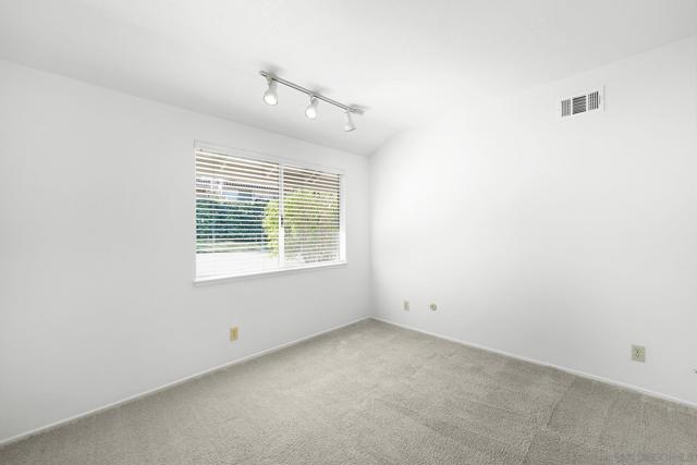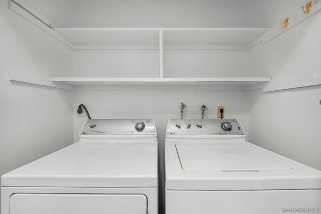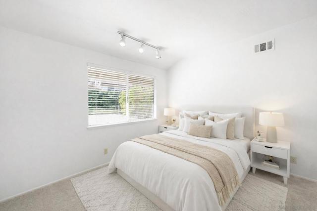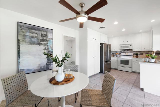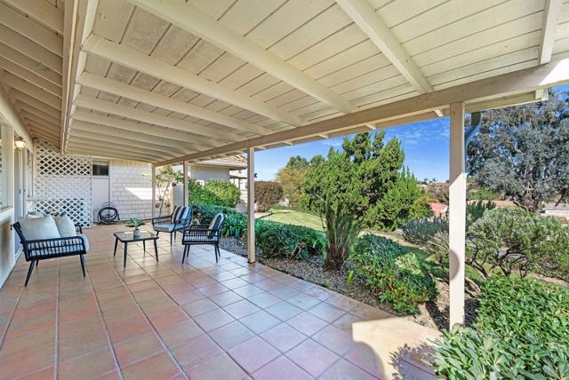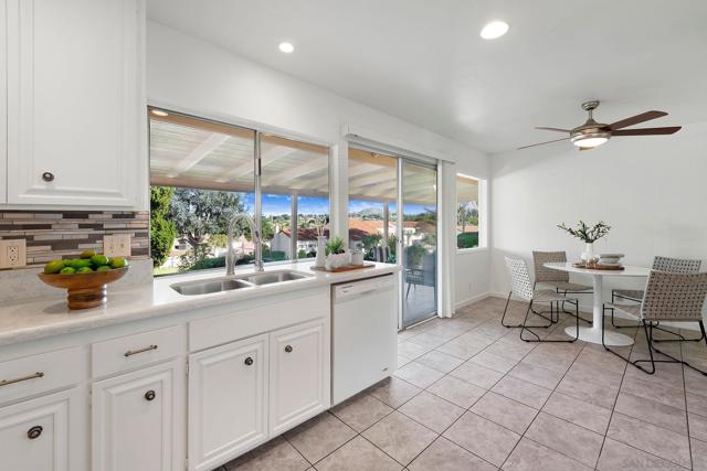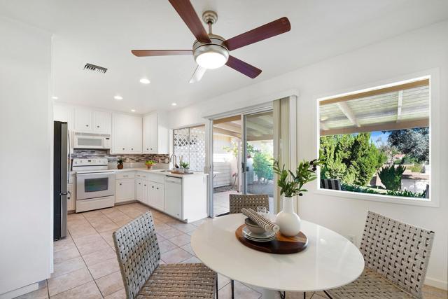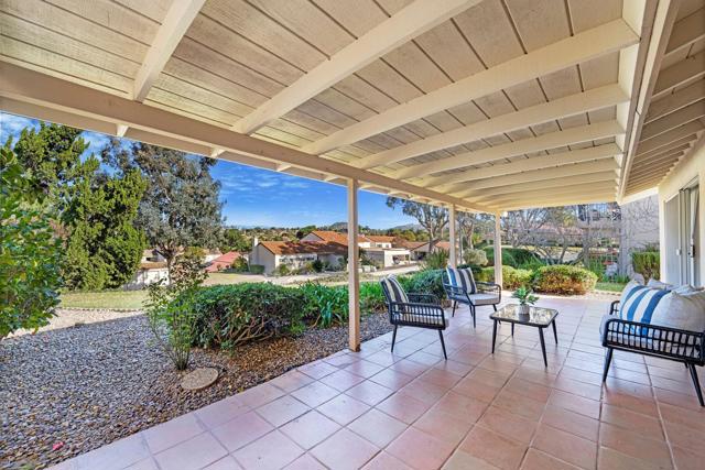 SINGLE LEVEL!! NO STAIRS!! Highly desirable and lovingly maintained 55+ Oaks North cul-de sac home boasts a coveted floor plan, no unit above or below, no steps and a single common wall! Quietly situated with direct greenbelt access, the home offers a private covered patio with serene mountain views in a vibrant and walkable community. The interior is bright and functional, featuring a freshly painted interior (2025) and a well-designed layout that maximizes natural light. The kitchen area includes quartz countertops and a delightful breakfast nook that adds everyday charm and practicality. Recent updates include a new furnace (2026), newer water heater (2024), and newer refrigerator (2024). The spacious living area features vaulted ceilings and a full-size dining space, creating an open and inviting atmosphere framed by abundant windows. Sliding doors provide direct access to the private covered patio, extending the living space outdoors and offering pleasant views of the surrounding greenery and hillside vistas. The oversized primary bedroom offers a comfortable retreat with ample closet space and a well-appointed bathroom featuring a separate vanity area and step-in shower, providing both function and privacy. A dedicated in-unit laundry closet offers additional storage and accommodates a full-size, side-by-side washer and dryer. The property also includes a generously sized private-use storage room and assigned covered carport space conveniently located near the unit. Residents enjoy a resort-style lifestyle with exclusive access to the first-class Oaks North Community Center, featuring a lap pool and jacuzzi with separate men’s and women’s locker rooms and saunas, fitness center, private library, woodshop, ceramics studio, art and sewing room, billiards room, game room, and more. Stay active with pickleball, tennis, lawn bowling, Tai Chi, yoga, water aerobics, and enjoy a full calendar of classes, clubs, and visiting lecturers. Social opportunities abound with card games, movie nights, bingo sessions, “Wine Down Wednesdays”, language classes and travel/hiking clubs—making it easy to stay connected, engaged, and have FUN! Located minutes from Oaks North Golf Course, Rancho Bernardo Inn, Bernardo Winery, walking trails and more, this home offers a truly special lifestyle opportunity in North County San Diego. Don't miss your chance to make it yours!