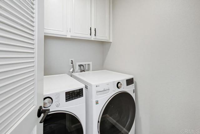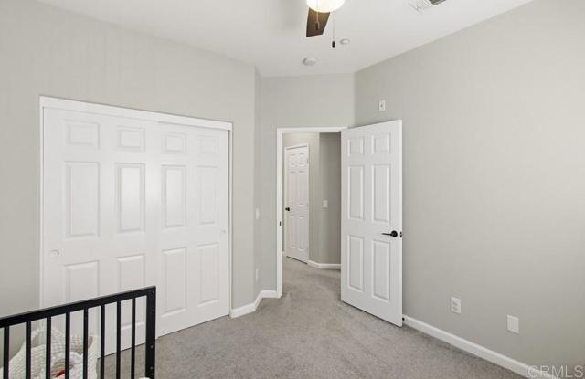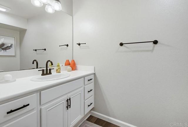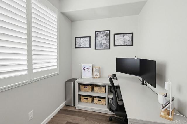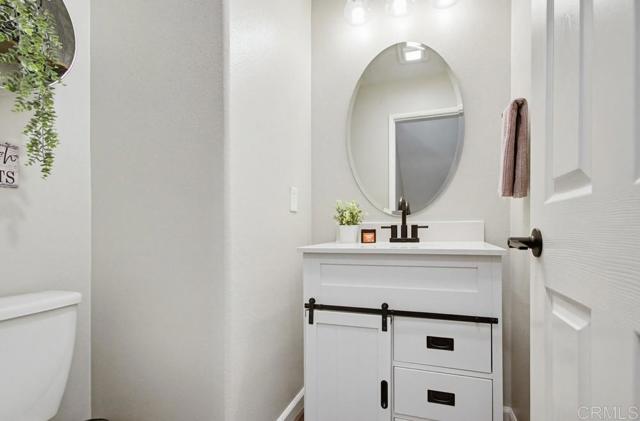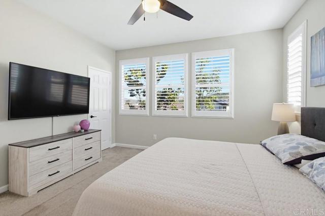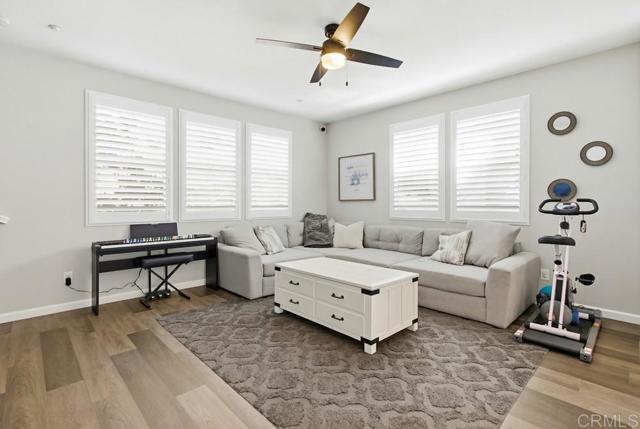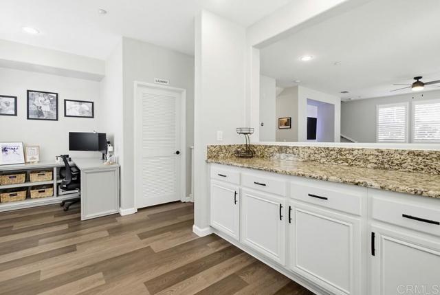 Nestled in the hills of Santee, this meticulously maintained, light and bright 3-bedroom, 3-bath plus office/optional 4th bedroom tri-level townhome offers 1,795 sq. ft. of stylish and functional living in the highly sought-after, gated community of Sky Ranch. This desirable end-unit features a spacious, enclosed entry courtyard, perfect for relaxing or entertaining, and leads into a versatile lower-level bonus room/office or optional bedroom with its own half bath. The main living level showcases an inviting open-concept layout highlighted by a generous family and dining area with recessed lighting and direct access to a private covered patio. The gourmet kitchen is beautifully appointed with granite countertops, white cabinetry, stainless steel appliances, gas cooktop, pantry closet, and abundant counter and storage space. A separate breakfast nook or workspace adds flexibility, while a full-size laundry room with upper cabinets completes the main floor. The primary suite offers peaceful valley and mountain views, dual connected walk-in closets, and a modern en-suite bath featuring dual sinks, extended counters, and contemporary fixtures. Additional bedrooms are well-sized and thoughtfully placed for privacy. Upgrades and features include: luxury vinyl plank flooring throughout the lower and main levels; carpet in bedrooms and upper hall/stair areas; dual-pane windows and plantation shutters throughout; central A/C and ceiling fans; tankless water heater; neutral gray paint with crisp white trim; attached oversized two-car garage, finished with custom SwissTrax flooring overlay. Residents of Sky Ranch enjoy resort-style amenities, including a sparkling pool and spa, playground, pet waste stations, and multiple built-in BBQ areas—all within a beautifully maintained gated community. Just minutes from shopping, dining, schools, lakes, and scenic hiking trails, this move-in-ready home offers comfort, convenience, and community all in one exceptional property.