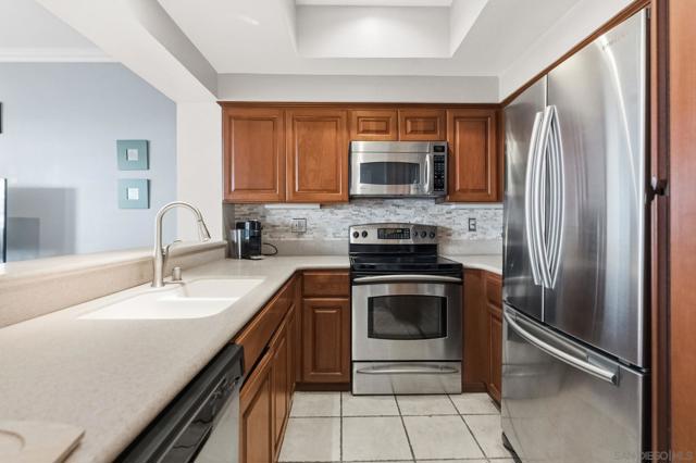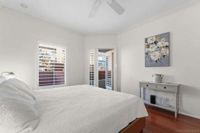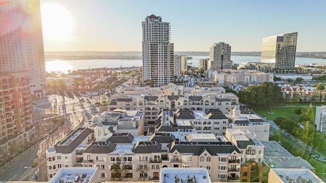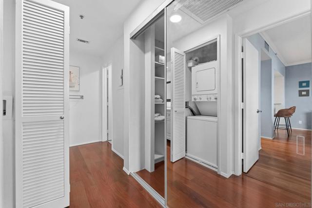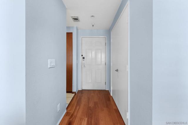 Welcome to Unit 317 at Columbia Place! Your peaceful downtown retreat in the heart of the Marina District! This spacious 1 bed, 1 bath condo offers the rare blend of privacy, walkability, and style. Enjoy dual access to a private balcony from both the living room and the primary bedroom, perfect for sipping coffee while taking in city light views. Inside, you'll find wood flooring, stainless steel appliances, warm wood cabinetry, and a dedicated dining area, living room, and bar seating. The updated bathroom features quartz countertops and a beautiful stone shower. The oversized walk-in closet offers endless possibilities! Use it for storage, or convert it into a home office or nursery. The unit includes in-unit laundry, newer HVAC (2022), and one assigned parking space. Columbia Place is a gated community with on-site security, a gym, and a jacuzzi. Best of all, you're just steps to Seaport Village, the marina, Gaslamp, Pantoja Park, restaurants, shops, and more. All without the downtown noise. Whether you're looking for a smart investment, a weekend getaway, or your full-time home base, this one has it all. (some images have been enhanced-added plants & towels).