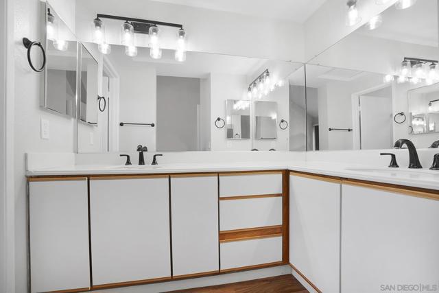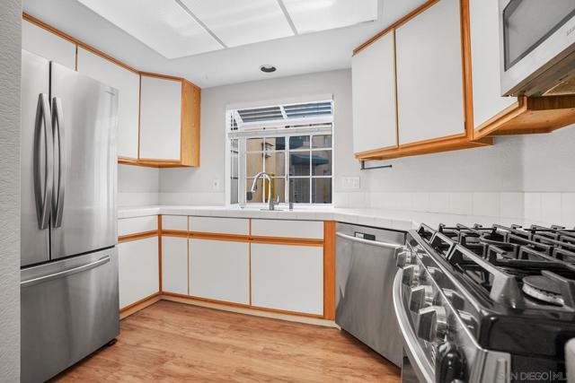 Discover luxury living in this exceptional 2-bedroom, 2.5-bath condo featuring vaulted ceilings and premium upgrades throughout. Both upstairs bedrooms boast private en-suite bathrooms with elegant Carrara tile, while beautiful Pergo Outlast flooring flows seamlessly across the main level. The heart of the home showcases a custom onyx-tiled fireplace and stylish black balusters. The updated kitchen comes fully equipped with all appliances: washer, dryer, refrigerator, microwave, dishwasher, and range - move-in ready! Step outside to your private oasis - the largest patio in the community! This fully paved outdoor space offers breathtaking mountain views and opens directly toward the mountains, perfect for entertaining or relaxation. Additional features include central air conditioning, heating, fresh interior paint, and attached garage. Enjoy resort-style community amenities including three swimming pools, three spas, tennis courts, fitness center, and clubhouse - perfect for active lifestyle living. Prime El Cajon location with top-rated schools including Rancho San Diego Elementary directly across the street, plus convenient access to shopping centers, restaurants, and daily amenities. This turnkey condo offers luxury living at its finest - schedule your private showing today!