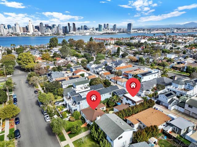 A rare offering in Coronado Village, 241–243 F Avenue presents two separate residences thoughtfully positioned on a generous 7,000 sq. ft. lot just moments from the Bay and the Ferry Landing. The front home, originally built in 1943, is a single-story 3-bedroom, 2-bath residence offering timeless character and everyday livability. Hardwood flooring, an inviting street presence, driveway parking, a one-car garage, and a private backyard create a comfortable setting in a highly desirable Village location. Positioned toward the rear of the property, the second residence is a two-story home built in 1971, also offering a three-bedroom, two-bath layout with one bedroom conveniently situated on the main level. The home features an inviting living space with sliding doors opening to a private backyard, along with a full bath and dedicated laundry. Upstairs are two additional bedrooms, including the primary bedroom with direct access to a private deck overlooking the downtown San Diego skyline. Three dedicated parking spaces further enhance functionality and ease of living. The generous 7,000 sq. ft. R1B-zoned parcel presents meaningful long-term potential, including possible redevelopment into two side-by-side residences, subject to buyer due diligence and City approvals. The property has also received a non-historic determination from the Historic Resource Commission, offering added clarity for those considering future renovation or reconfiguration. A unique and compelling opportunity in one of Coronado Village’s most sought-after locations, rich with possibility. Matterports are available for both residences. The front house is roughly 1,156 square feet and the back house is roughly 1,270 square feet, per Matterport.