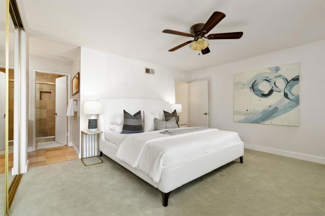 Tierrasante Treasure. Beautiful large 1,989 sq. ft. Townhome has 4 bedrooms upstairs; 4th bedroom has closets but often used as a flex room. Direct 2 car-garage access; in unit laundry; Dual pane windows. This home is situated as an "inner unit" not on freeway or main road. Plantation shutters throughout. Home has air-conditioning. All electrical can lights changed to LED. Moen water shut off installed in garage. Garage recently updated. Newer roof installed in 2025. Updated within the last few years with LVP flooring on entry level and carpet upstairs. Newer Kitchen & appliances. Newer bathrooms. Villa Monterey is well located off freeway 15 with lush green open spaces, 3 pools & 2 Spas, tennis courts, (RV parking with additional fee). Tierrasante often called T-town by the locals offers access to Trails, Rec center, multiple parks, shops and schools