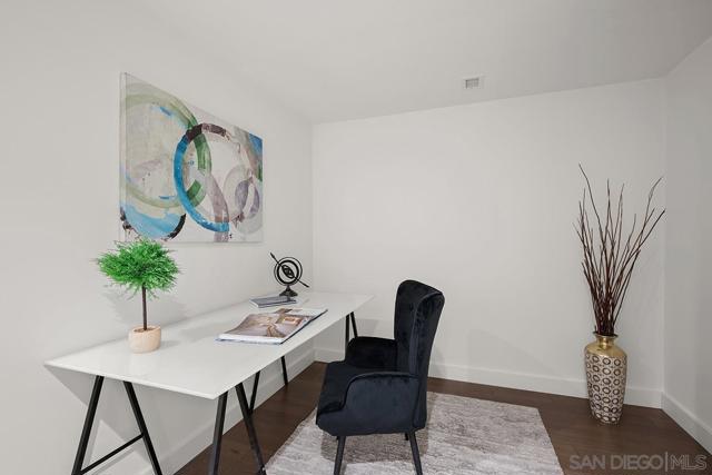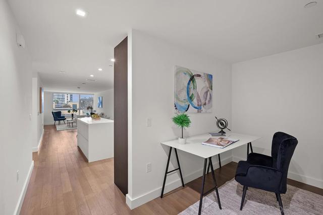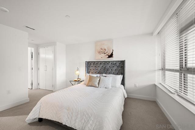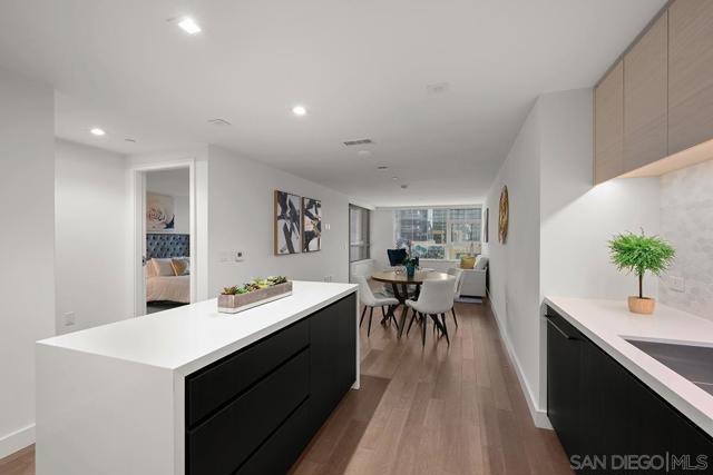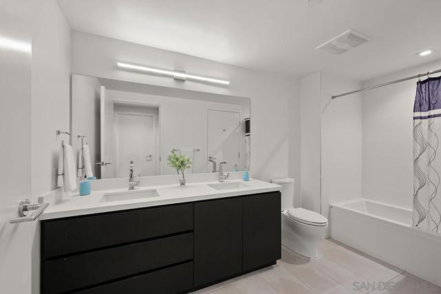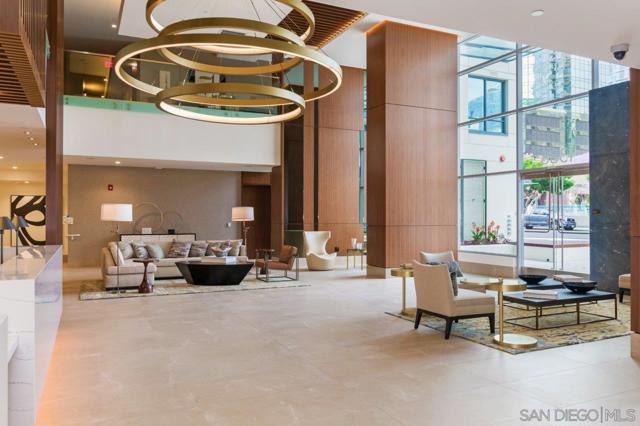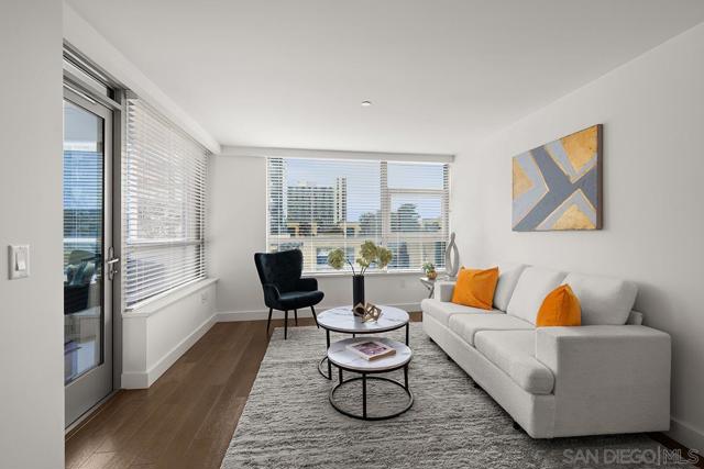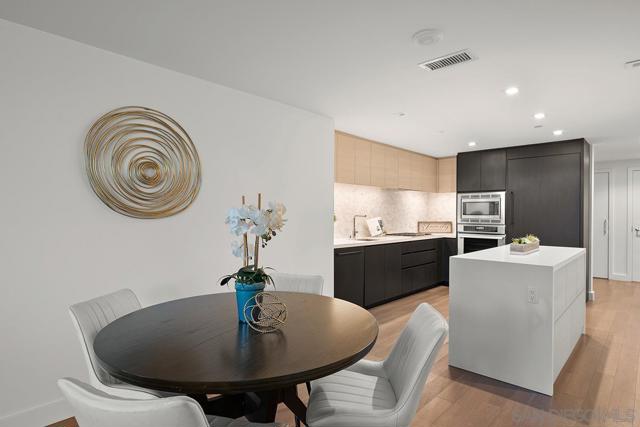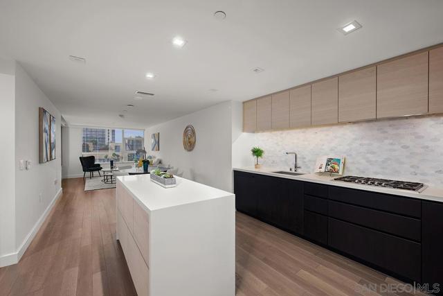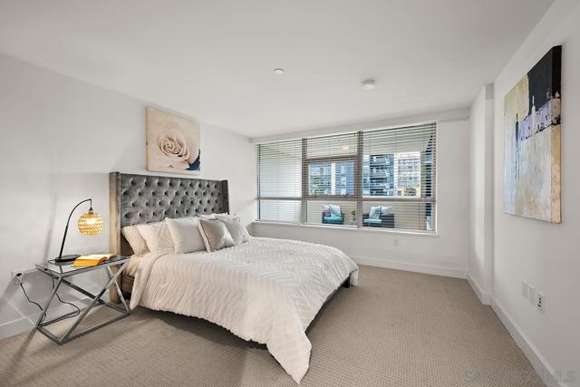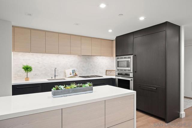 Welcome to Savina, where modern urban living meets refined design. This beautifully appointed residence blends style, comfort, and thoughtful details throughout. The expansive west-facing private terrace, a rare find at this price point, extends your living space outdoors, perfect for morning coffee or sunset views over the skyline. Inside, the chef’s kitchen showcases premium stainless Thermador appliances, a cabinet-front refrigerator, striking mosaic tile backsplash, and an oversized waterfall-edge island ideal for entertaining. The open layout flows into a sun-filled living area with rich hardwood floors, contemporary finishes, and generous windows framing city views, plus direct access to the terrace for seamless indoor-outdoor living. The spacious primary suite is a true retreat, offering a large walk-in closet and a spa-inspired bath with porcelain tile floors, quartz double vanity, rain shower, and polished Grohe fixtures. Savina offers resort-style amenities, a walkable location, and a lifestyle designed for those who appreciate the very best of Downtown San Diego living. Savina by Bosa is one of San Diego’s newest high rises and steps away from Little Italy, one of Forbes Best Neighborhoods. The community’s first-class amenities include amazing outdoor pool and spa, indoor gym, steam room & sauna, dog wash and outdoor pet park, bicycle repair room, and club house/game room and BBQ area for entertaining. Literally steps away from Waterfront Park, where you can enjoy concerts and outstanding community bay activities. And when it’s time to get away, take advantage of close proximity to the airport, cruise terminal, and train & trolley stations. Whether taking in the sunset from your private balcony or making your way to one of Little Italy’s countless renowned restaurants, city living is beautiful at Savina.