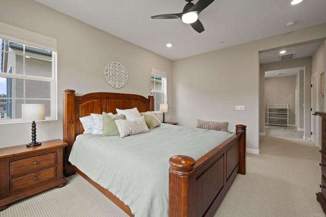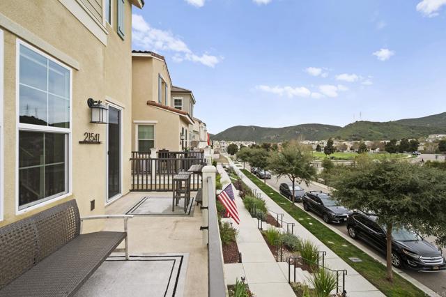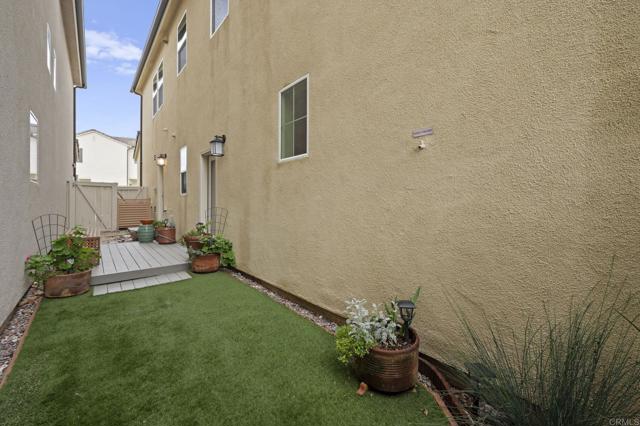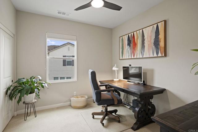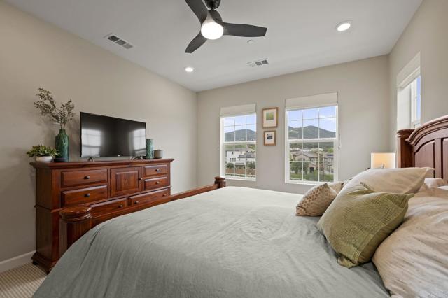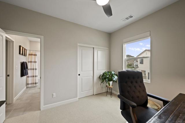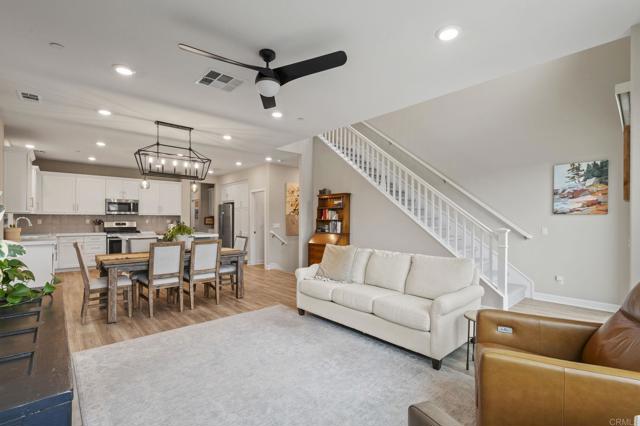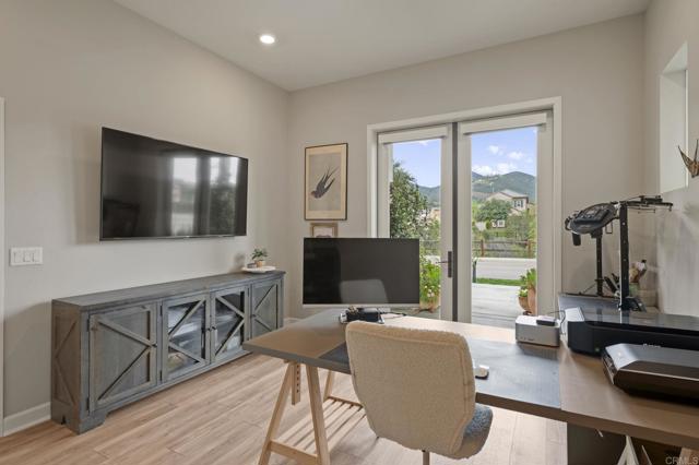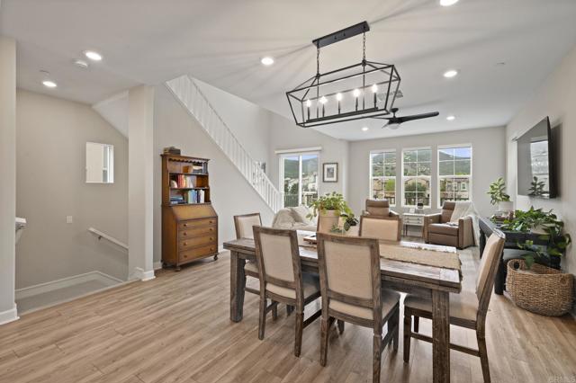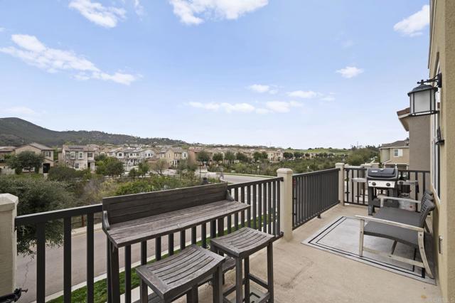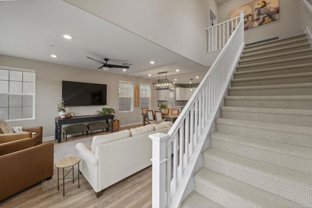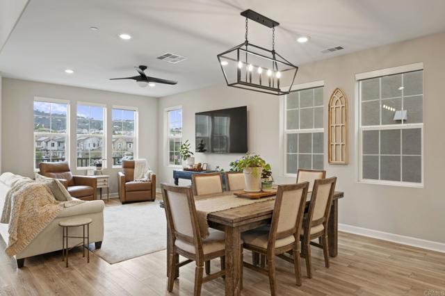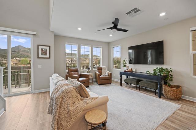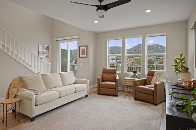 Beautifully upgraded home with flexible first level live/work option w/ full bathroom, upgraded flooring, designer lighting, custom window treatments, tankless water heater, and balcony with a ridgeline mountain backdrop. Thoughtfully upgraded by the original owner with over $45K in builder flooring enhancements. The second level features Shaw Providence Plus luxury vinyl plank flooring and an open concept layout connecting the kitchen, dining, and family room. Large windows and sliding glass doors bring in natural light and open directly to the balcony overlooking the mountain views — ideal for entertaining or everyday relaxation.. The kitchen includes white countertops, Emser gloss chevron tile backsplash, Pottery Barn “Paxton” glass pendant lighting, island w/ seating, walk-in pantry w/ built-in shelving, ample cabinet storage, and a recently replaced Bosch dishwasher (2025). The first-level space is designed for flexible live/work use and features a private exterior access. The attached full bathroom offers a seamless, zero-entry walk-in shower complete with a built-in seat and grab bars. The full bathroom includes tile flooring, white shower, large mirror, and recessed lighting. A conveniently located powder room on the second level features tile flooring and a pedestal sink, with built-in cabinetry just outside for additional storage. Both extra-wide staircases are finished with upgraded plush Berber carpet and enhanced padding, creating a comfortable transition between all levels. The third level primary suite includes recessed lighting, spacious walk-in closet, ceiling fan and ensuite bathroom w/ dual sinks, soaking tub, and separate glass shower. Custom blinds roller shades and Maritime Alabaster grass privacy shades are installed throughout the home, providing a cohesive, elevated window finish and added privacy in all bedrooms and bathrooms. Two additional second level bedrooms include upgraded Tuftex Berber carpet and ceiling fans. Functional shared bathroom layout w/ dual sinks, recessed lighting, and shower/tub combo. Dedicated second level laundry room w/ upper and lower cabinetry, drawer storage, counter space, and natural light window. Thoughtfully selected neutral finishes throughout make it easy to personalize the space and adapt it to your own style over time. The front garden is thoughtfully planted and well established, with layered perennial beds and climbing vines that create seasonal color, attract pollinators, and add welcoming curb appeal.The backyard includes low maintenance turf and space to customize your outdoor entertaining vision. Harmony Grove Village is a master-planned community with gorgeous mountain ridgeline views, multipurpose trails, a gated pool for homeowners, dog and equestrian park, multiple private parks, and the expansive 4th of July Park (open to the public). The Grove is the perfect place to enjoy the outdoors—it includes a pool, jacuzzi, wading pool, barbecues, shaded tables, play structure, and a covered lounge area with outdoor furniture and fireplace.