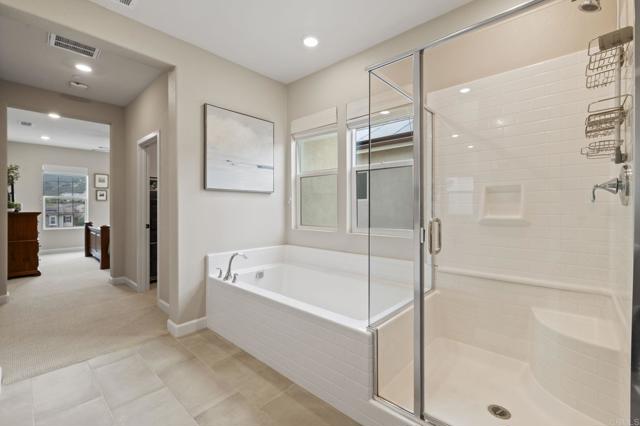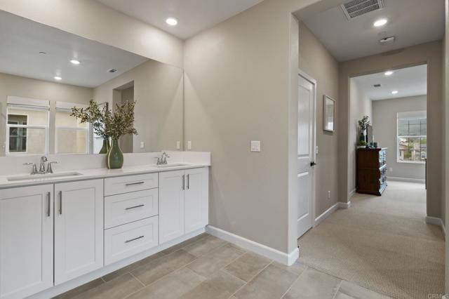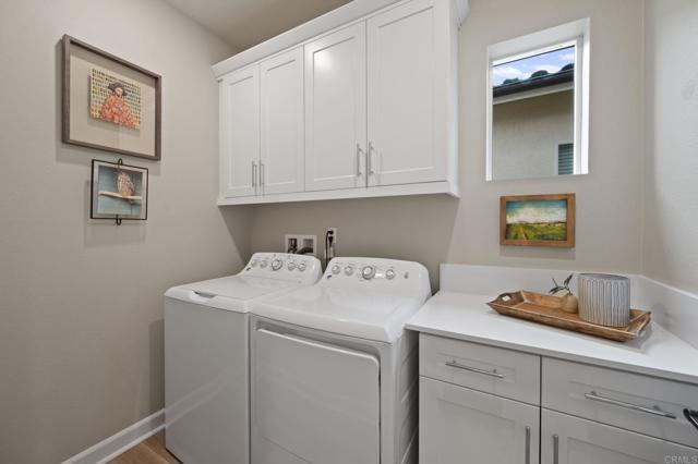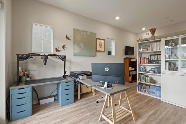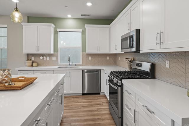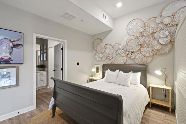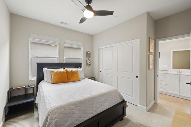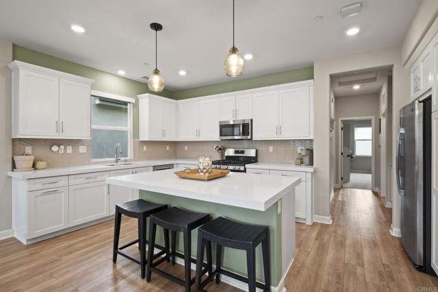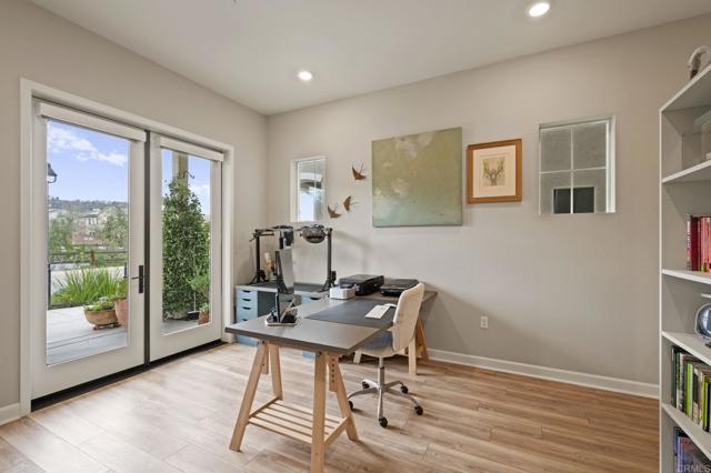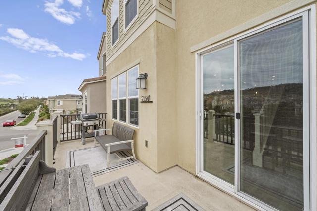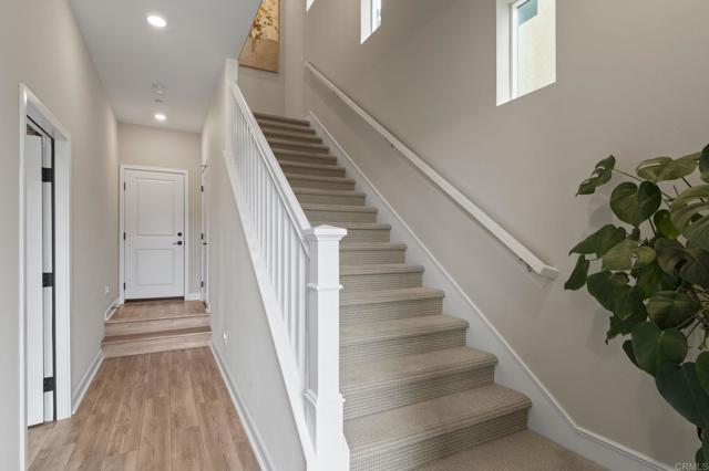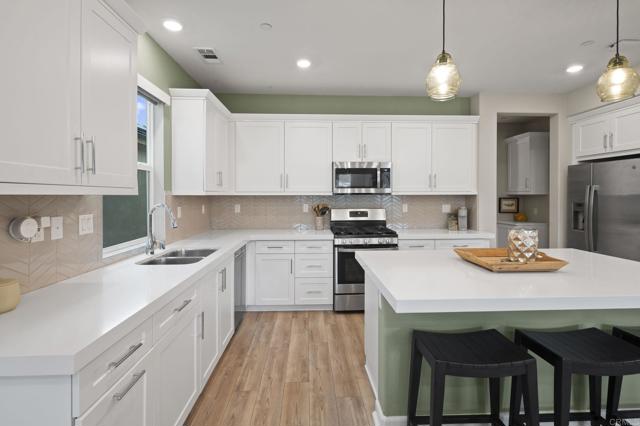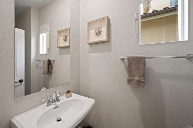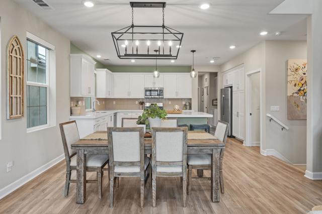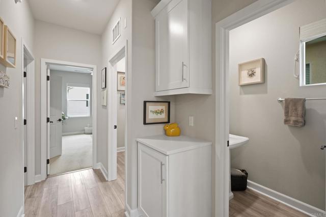 Beautifully upgraded home with flexible first level live/work option w/ full bathroom, upgraded flooring, designer lighting, custom window treatments, tankless water heater, and balcony with a ridgeline mountain backdrop. Thoughtfully upgraded by the original owner with over $45K in builder flooring enhancements. The second level features Shaw Providence Plus luxury vinyl plank flooring and an open concept layout connecting the kitchen, dining, and family room. Large windows and sliding glass doors bring in natural light and open directly to the balcony overlooking the mountain views — ideal for entertaining or everyday relaxation.. The kitchen includes white countertops, Emser gloss chevron tile backsplash, Pottery Barn “Paxton” glass pendant lighting, island w/ seating, walk-in pantry w/ built-in shelving, ample cabinet storage, and a recently replaced Bosch dishwasher (2025). The first-level space is designed for flexible live/work use and features a private exterior access. The attached full bathroom offers a seamless, zero-entry walk-in shower complete with a built-in seat and grab bars. The full bathroom includes tile flooring, white shower, large mirror, and recessed lighting. A conveniently located powder room on the second level features tile flooring and a pedestal sink, with built-in cabinetry just outside for additional storage. Both extra-wide staircases are finished with upgraded plush Berber carpet and enhanced padding, creating a comfortable transition between all levels. The third level primary suite includes recessed lighting, spacious walk-in closet, ceiling fan and ensuite bathroom w/ dual sinks, soaking tub, and separate glass shower. Custom blinds roller shades and Maritime Alabaster grass privacy shades are installed throughout the home, providing a cohesive, elevated window finish and added privacy in all bedrooms and bathrooms. Two additional second level bedrooms include upgraded Tuftex Berber carpet and ceiling fans. Functional shared bathroom layout w/ dual sinks, recessed lighting, and shower/tub combo. Dedicated second level laundry room w/ upper and lower cabinetry, drawer storage, counter space, and natural light window. Thoughtfully selected neutral finishes throughout make it easy to personalize the space and adapt it to your own style over time. The front garden is thoughtfully planted and well established, with layered perennial beds and climbing vines that create seasonal color, attract pollinators, and add welcoming curb appeal.The backyard includes low maintenance turf and space to customize your outdoor entertaining vision. Harmony Grove Village is a master-planned community with gorgeous mountain ridgeline views, multipurpose trails, a gated pool for homeowners, dog and equestrian park, multiple private parks, and the expansive 4th of July Park (open to the public). The Grove is the perfect place to enjoy the outdoors—it includes a pool, jacuzzi, wading pool, barbecues, shaded tables, play structure, and a covered lounge area with outdoor furniture and fireplace.