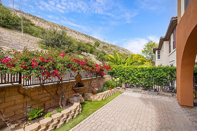 Experience the ultimate in luxury and style encompassing this extensively redesigned and renovated residence in the beautiful gated Bungalows at Escala community. This rarely available 3 bedroom, 2.5 bathroom floorplan, the largest of the Bungalows units, has been crafted to create a more functional and open living space with fine attention to details. This unit lives like a single-family home, offering privacy and serenity while located in the center of San Diego, only minutes to just about everything. Enjoy gardening or relaxing in your private, gated backyard with no homes behind you, surrounded by mature landscaping and peaceful panoramic hillside views. Interior highlights include a new custom kitchen with an oversized island, high-end KitchenAid appliances, quartz countertops, a built-in under counter microwave oven drawer, under cabinet lighting, and lighted soft-close drawers. A large walk-in pantry with finished under stair area provides ample storage. The new full sized LG washer and dryer with a butcher block folding counter offer additional convenience. Stunning wide-plank, French Oak flooring meticulously installed throughout the home, with custom built wood stairs and stair railings. A new oversized fireplace, faced in rustic limestone with wood shelves and a stately mantle, invites warmth. The spacious primary bedroom features an exquisite new bathroom with a large walk-in tiled shower and a freestanding soaking tub. All interior walls and ceilings are hand troweled. New dimmable lighting and ceiling fans. 3rd bedroom is showcased as a lighted walk-in closet.