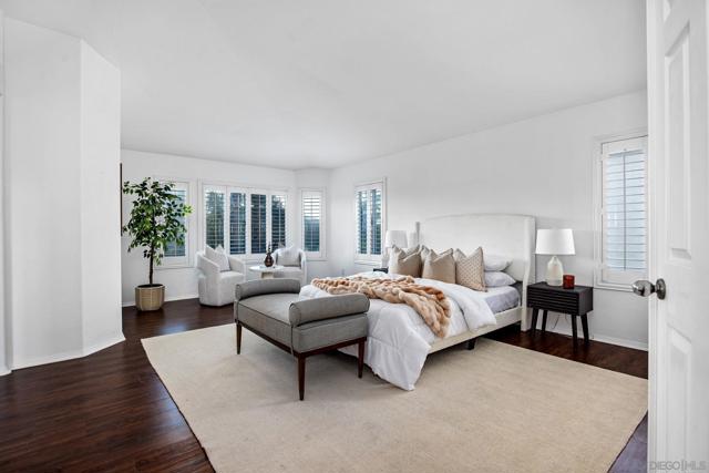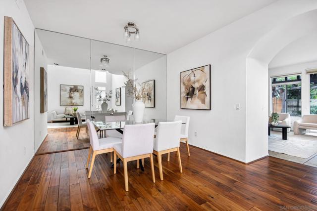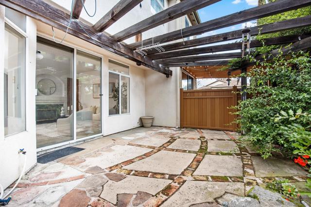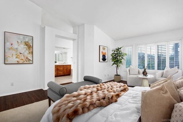 This beautifully designed twinhome offers the privacy and presence of a detached residence, enhanced by a turfed front yard and a truly private setting. Step inside to soaring second-story ceilings and an abundance of natural light that highlights the warm wood flooring throughout the main living areas. The kitchen opens seamlessly to the family room, creating an ideal space for both everyday living and entertaining, and features a center island, granite countertops, rich dark wood cabinetry, and a cozy fireplace anchoring the space. Upstairs, a versatile loft provides flexible living options, while one bedroom showcases French doors and plantation shutters, with wood flooring throughout the upper level. The updated bathroom offers a fresh, modern feel. Additional highlights include a custom closet, two bedrooms with walk-in closets, a third bedroom, and a dedicated laundry room. Ideally located near shopping, dining, and parks—including Del Mar Trails Park—with convenient access to State Route 56 and Interstate 5, this thoughtfully appointed home blends comfort, style, and accessibility.