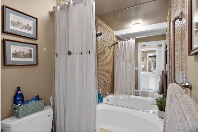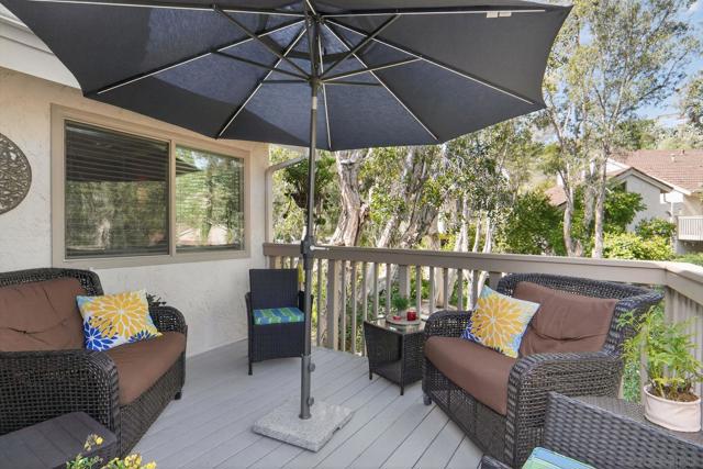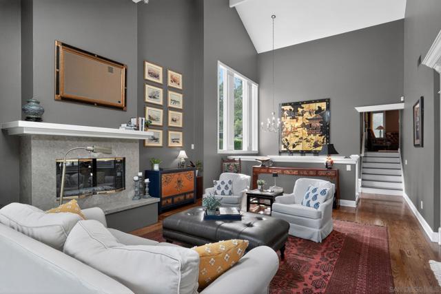 Kensington Park Villas! The best location at the corner of Escena and Pintoresco this detached home (one of the four detached in the complex) is situated near the walking path and the multiple ponds in the heart of the community. Upon entering it is clear to see that this unit is full of extraordinary details. Hardwood floors throughout most of the unit, striking moulding and trim embellishments give this home a custom feel. Lower level has two bedrooms and one full bath. Access to a private patio is off one of these bedrooms. Middle level is the extraordinary living room with vaulted ceiling, skylights and a classic fireplace. Remodeled kitchen, separate dining room and access to the patio through sliding doors taking in the peaceful view. Quiet!! Top level (all short staircases) is the primary bedroom (additional mini split in this room) with ensuite bath and a family room also with another bath. This is easily converted to a fourth bedroom. Complex has two pools, walking paths, club house, an access gate into Kensington proper and is a gated community!