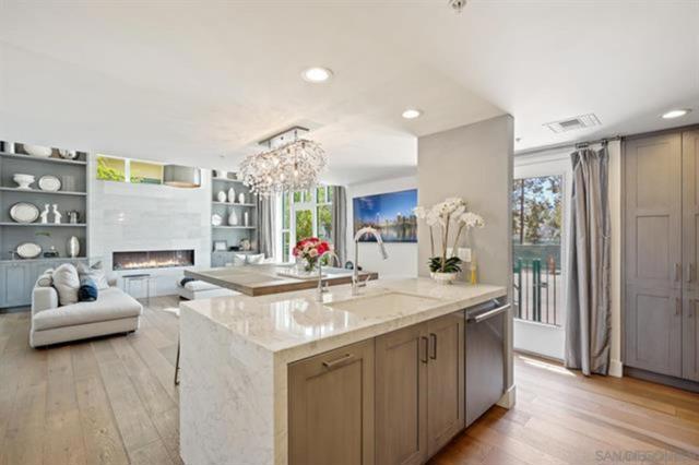 Beautifully designed and completely remodeled Townhome with no expense spared! Gorgeous South-facing residence has no neighbors above or below, and is located on the end so very private. Interior finishes feature Tuscan Carrara Marble Counters, wide plank floors throughout, high-end appliances w/ 88 bottle wine cooler, stunningly furnished & kitchen is completely outfitted so residence is ready for occupancy. Owners will consider 1 to 12 months or more Lease Period. Includes 2 Side by Side parking spaces. Horizons is located in the Heart of the Marina District within walking distance to Gaslamp District, the Waterfront, Little Italy, all the best restaurants, the Ball Park & major grocery is right across the street. Beautiful FINISHES and Beautifully FURNISHED! The high-rise community of Horizons includes pool, spa, fitness center, community recreation room, concierge and security.