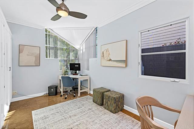 Nestled on a coveted corner lot in the prestigious "Golden Triangle" of Coronado Village, this contemporary home combines timeless elegance with modern functionality. Thoughtfully designed and beautifully upgraded, every detail invites you to live the quintessential coastal lifestyle. Step into the remodeled kitchen, a true chef’s delight, featuring a generous island, pendant lighting, intricate backsplash, and top-of-the-line appliances including a Dacor refrigerator and Thermador oven. The spacious dining area, complete with custom built-ins, flows effortlessly to the private courtyard through La Cantina doors. Here, you’ll find an entertainer’s dream—a tranquil space with a built-in barbecue, a soothing fountain, and ample room for al fresco dining or relaxing under the stars. The inviting living room is the perfect retreat, boasting an electric fireplace and French doors that also lead to the courtyard, offering seamless indoor-outdoor living. A versatile office with a Murphy bed and one additional bedroom are conveniently located on the main level. Upstairs, the loft provides an additional gathering space, workout area, or home office. The primary suite is a true haven, featuring two closets, direct access to a large view balcony, and a spa-like bath with a Jacuzzi tub, steam shower, and dual sinks. Multiple decks offer the perfect vantage points for enjoying the gorgeous views of Glorietta Bay and Coronado’s iconic sunsets. Step outside your door and into a vibrant, walkable neighborhood that epitomizes the best of Southern California living. This remarkable property isn’t just a home—it’s a lifestyle. Don’t let this rare opportunity pass you by!