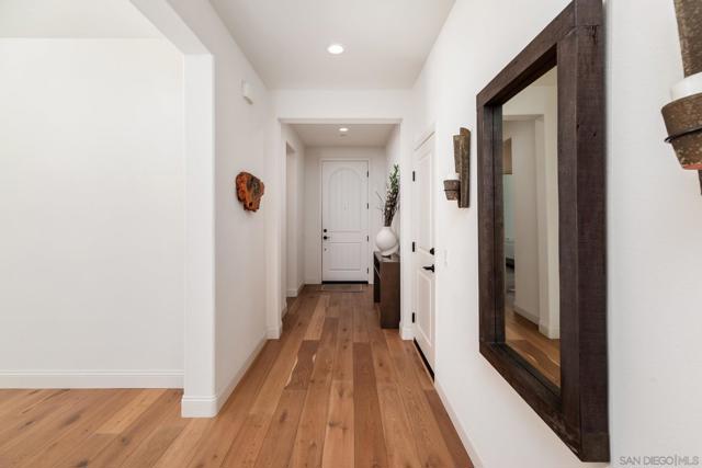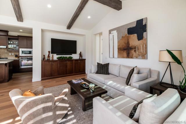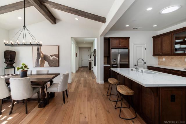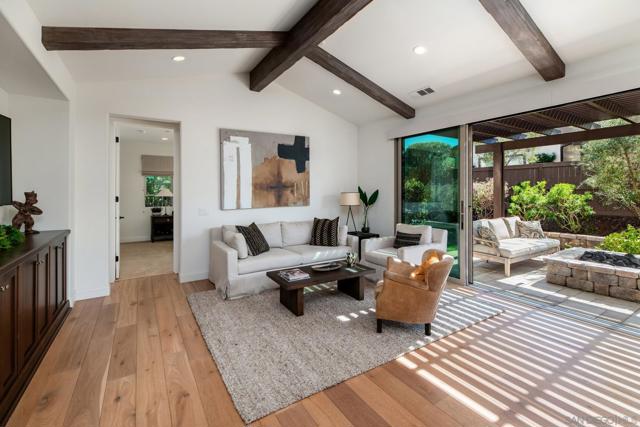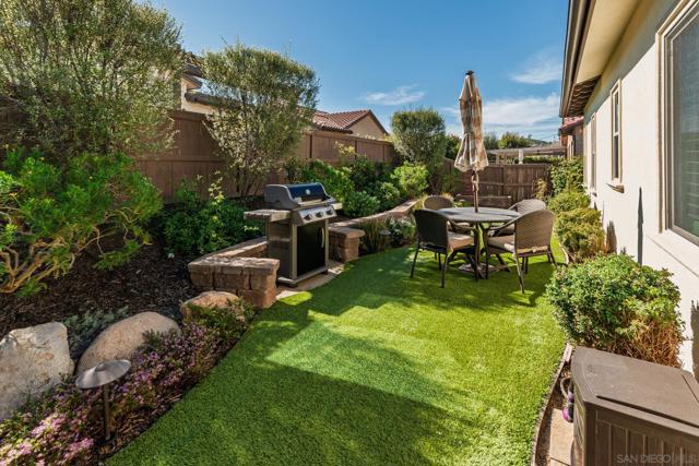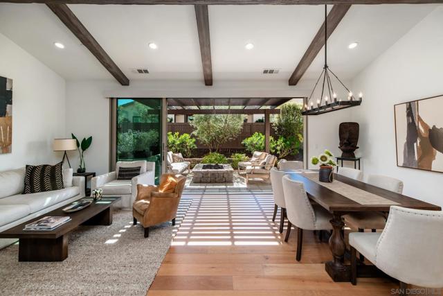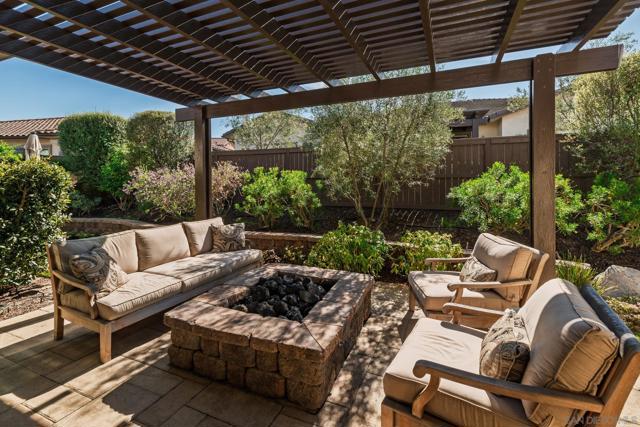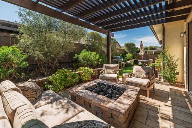 Set within the gated 55+ community of Auberge at Del Sur, this "Cottage" residence blends thoughtful design with relaxed indoor/outdoor living in a neighborhood known for its active & welcoming atmosphere. The home features an open layout where vaulted ceilings & exposed wood beams create warmth & architectural character. A wall of custom built-ins grounds the living room, while expansive sliding doors draw the eye outward to a private backyard retreat centered around a fire pit & surrounded by mature landscaping & fruit trees. The connection between inside & out is effortless making it ideal for everyday living & quiet evenings. The kitchen sits at the heart of the home, designed for both function & flow, featuring a large island, quartz countertops, generous cabinetry, walk-in pantry, & connected laundry room with built-in storage. Positioned for privacy, the primary suite feels serene & tucked away, complete with custom built-ins, direct backyard access, & a spacious bath with soaking tub & walk-in closet. The secondary bedroom serves as the ideal guest room & the optional 3rd bedroom overlooking the lush backyard is the perfect home office with ample built-in storage. Additional features include hardwood flooring, custom window treatments, solar panel system, electric vehicle charging, solar tube skylights, & Culligan water softener system. Residents of Auberge at Del Sur enjoy resort-style amenities including a pool & spa, gym, pickleball courts, clubhouse, dog park, & a full calendar of social activities that foster a connected & engaged community.
